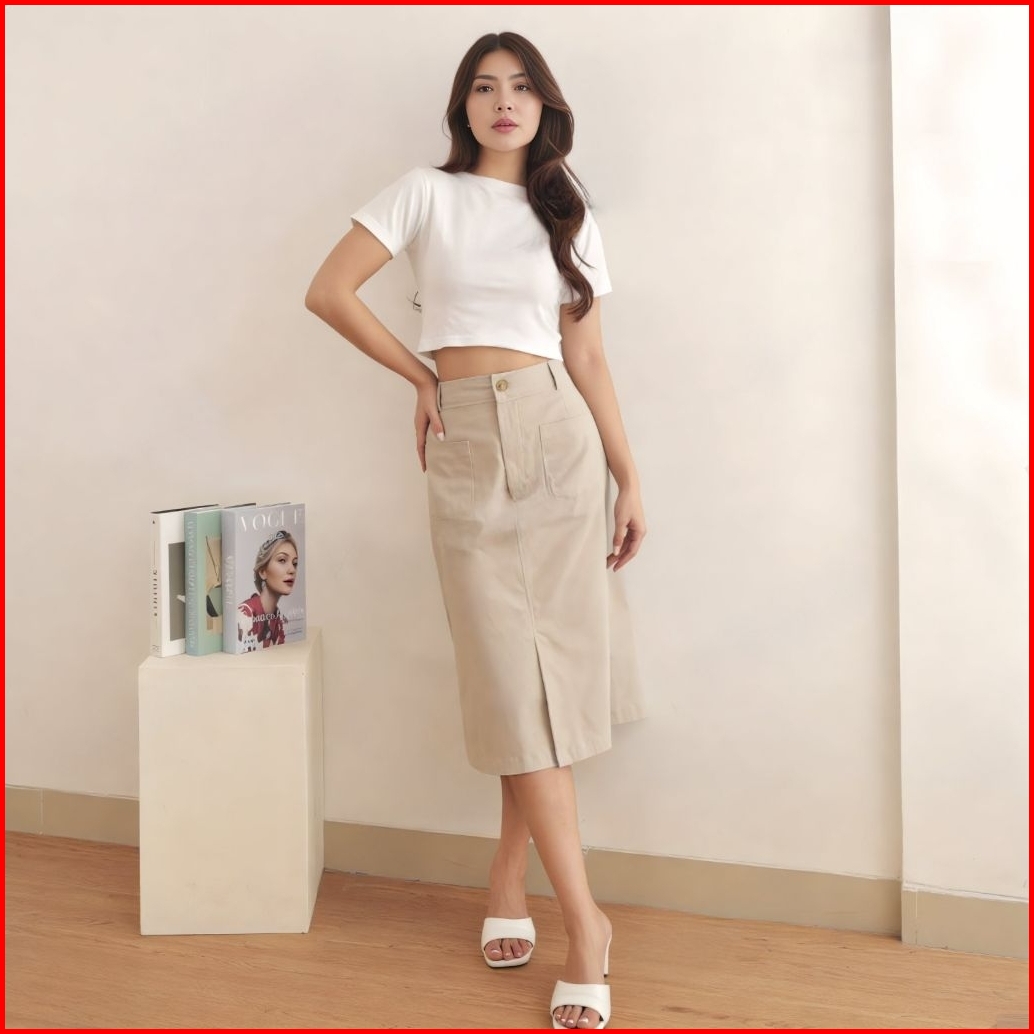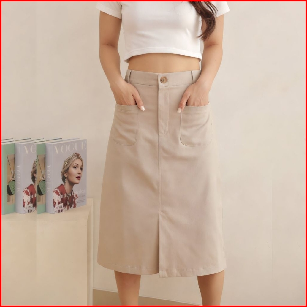 Becca Skrit Midi 7 8 Rok Midi Belahan Depan Highwaist Rok Katun Tebal Wanita Androk A Linen