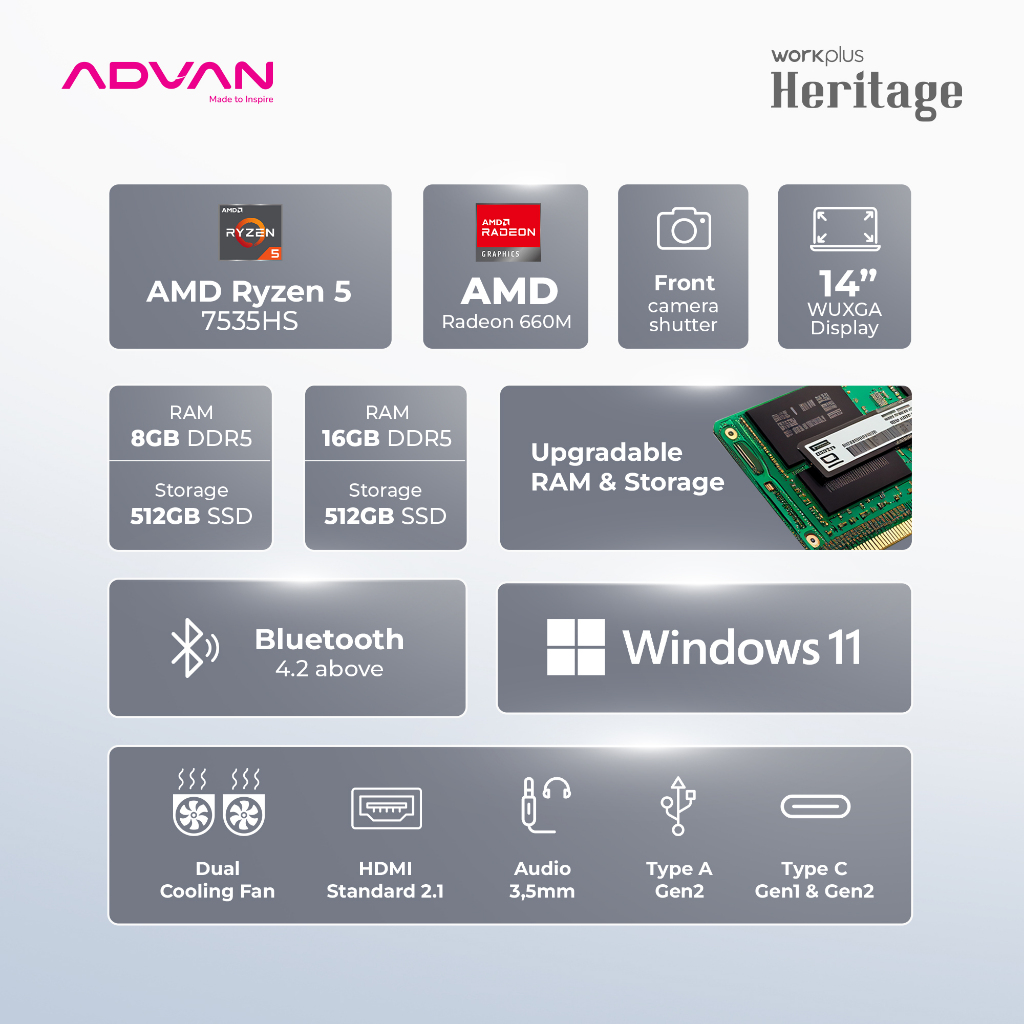 ADVAN Workplus HERITAGE AMD Ryzen 5 7535HS RAM32GB SSD2TB 14'' IPS Wuxga Windows 11