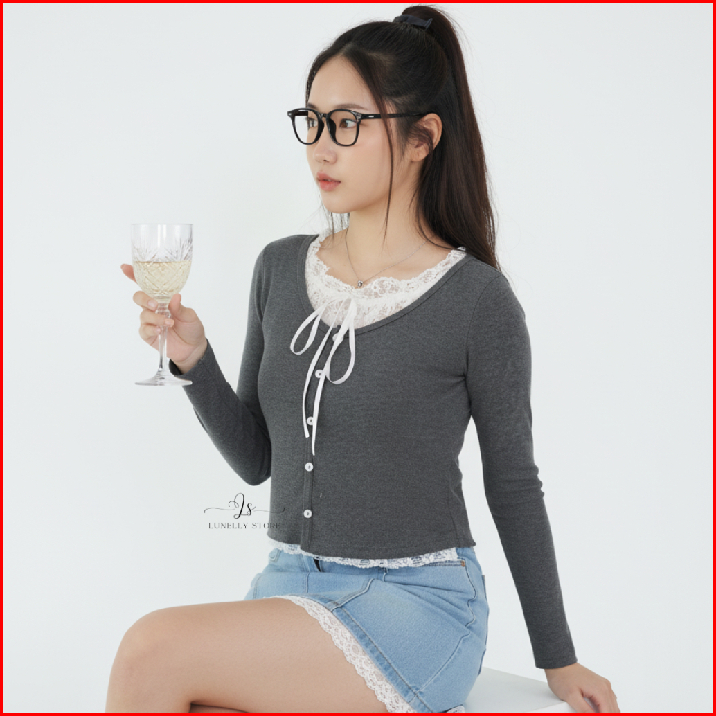 Lunelly Crop Top Stevy Bow Top Y2k Coquette Stretch Knit Renda Pita Korean Style Aesthetic Wanita Crop Top Wanita Lengan
