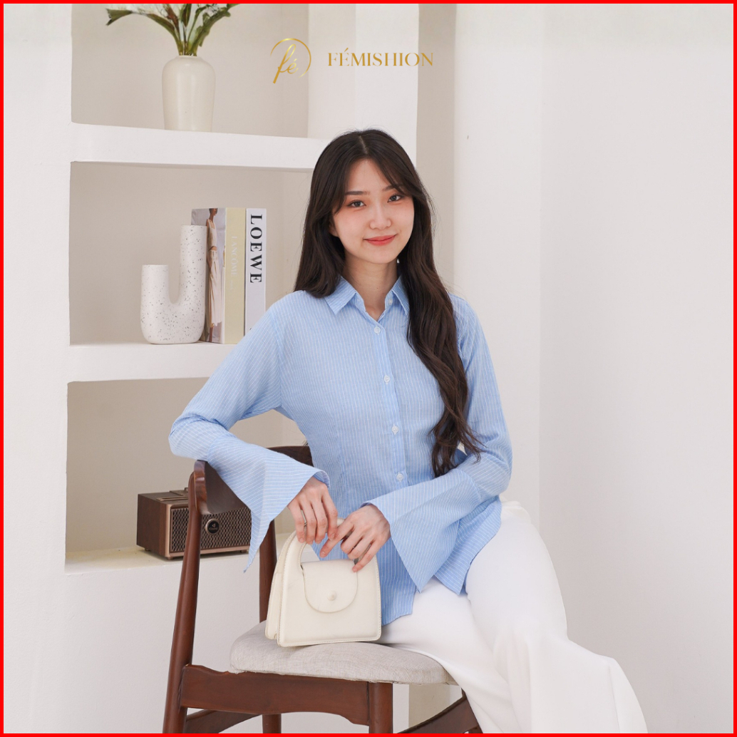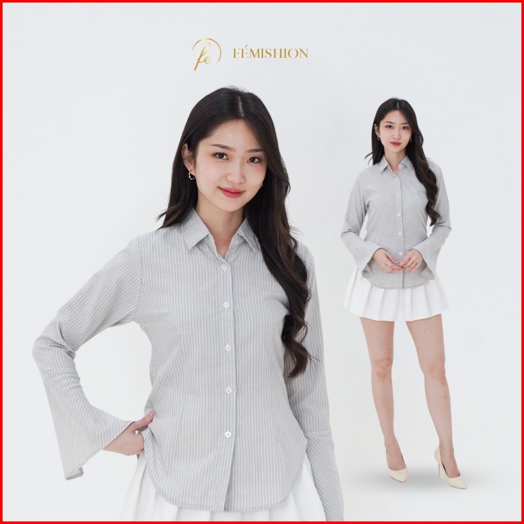 Femishion Career Glow Kemeja Kerja Wanita Atasan Salur Berkaret Fitted Press Body Korea Kekinian Pink Biru Abu Slim Fit