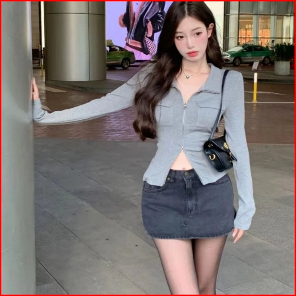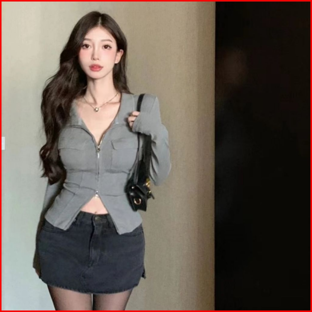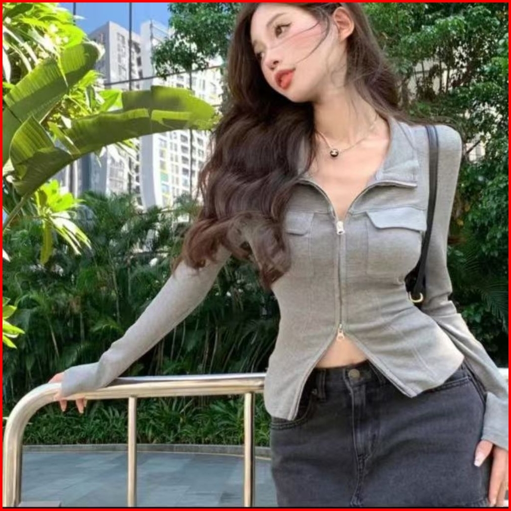 Atasan Lengan Panjang Ziper Pas Body Wanita Korea Stylish M696