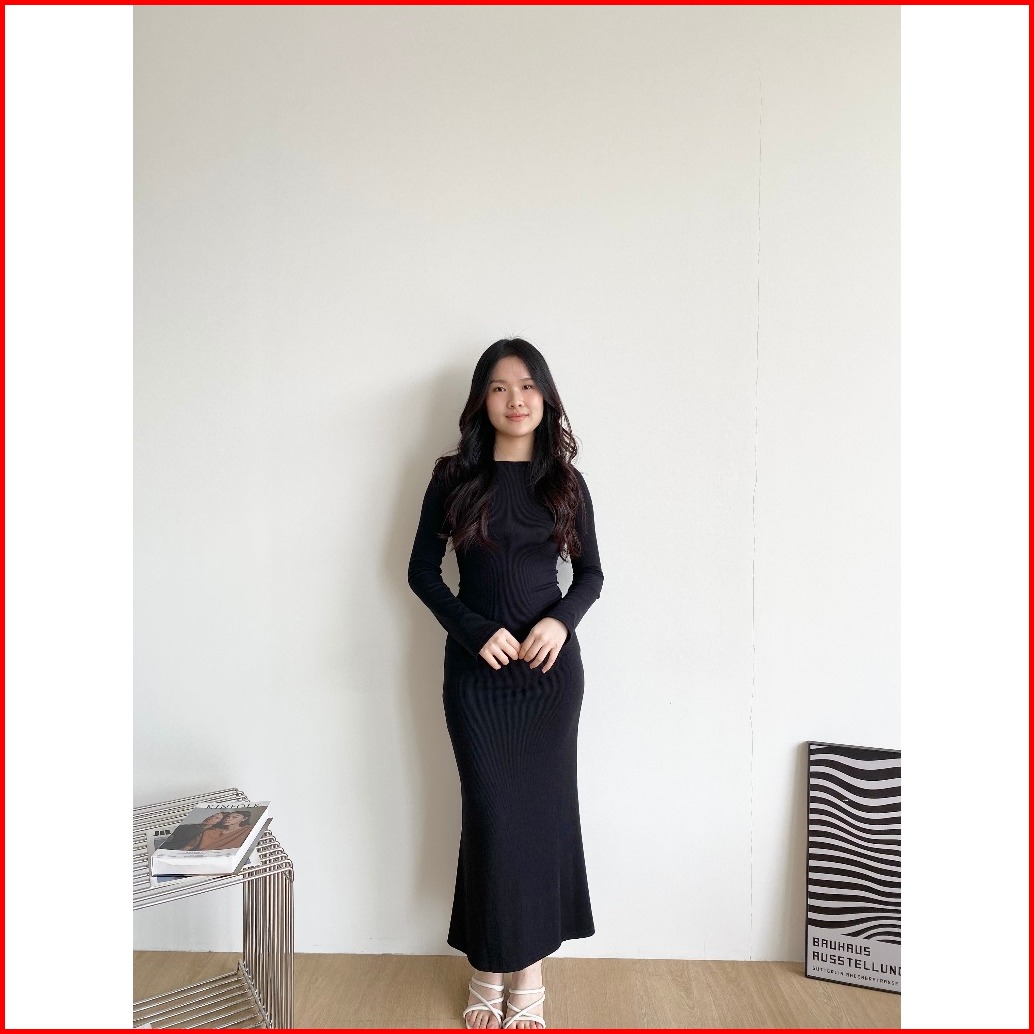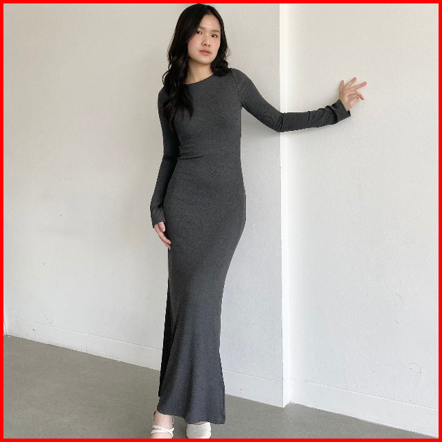Flowfit Dress Press Body Korean Long Dress Knit Bodycon Wanita Longsleeve