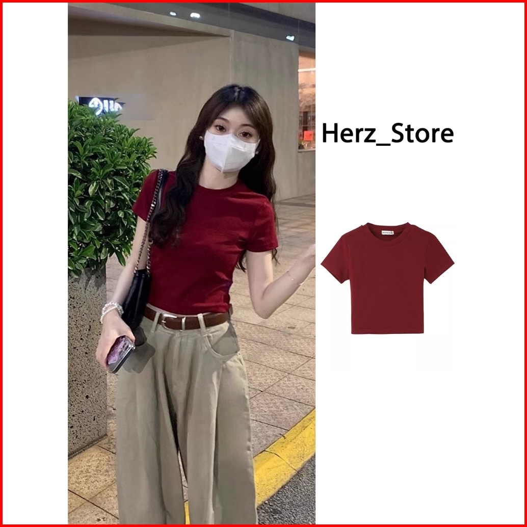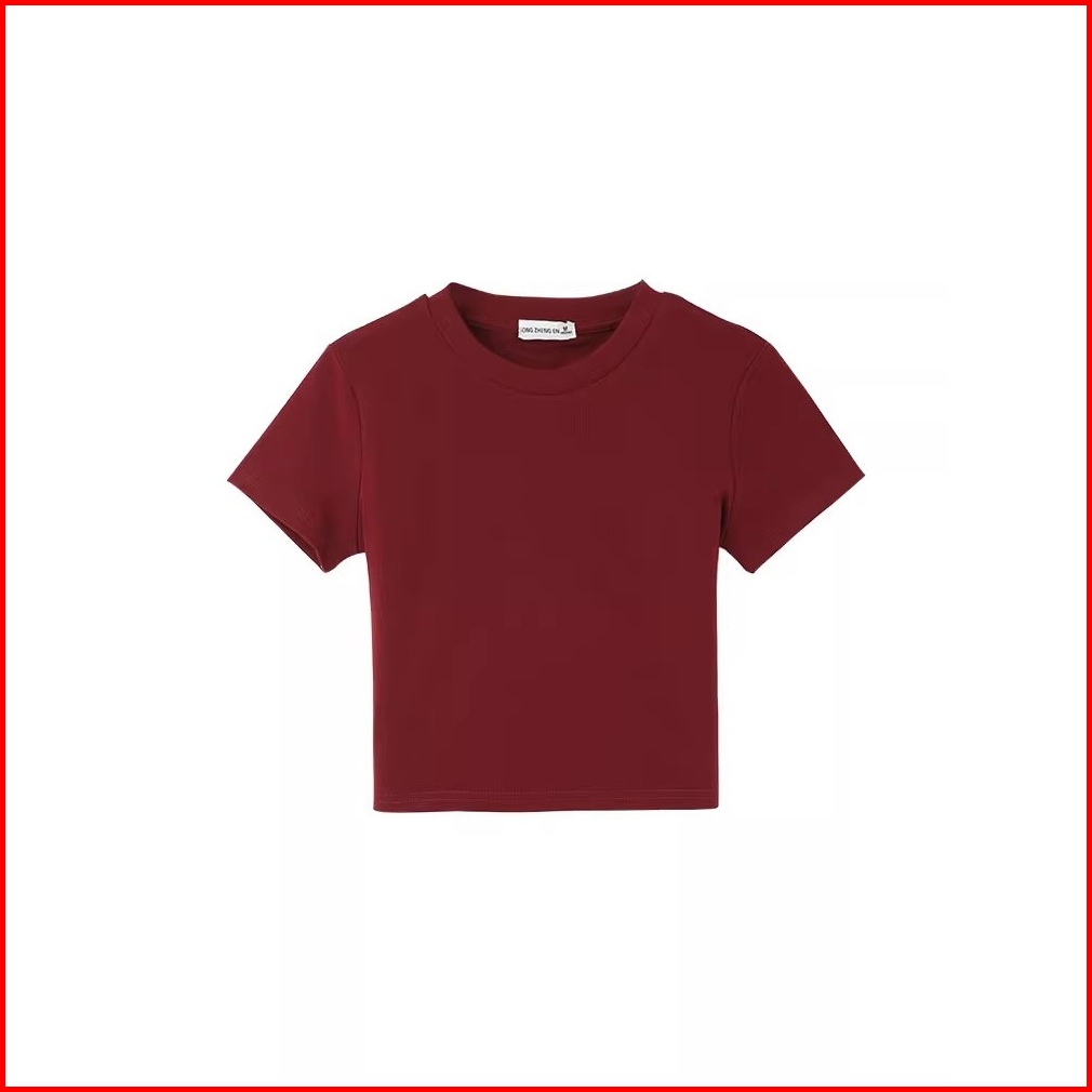 T Shirt Merah Lengan Pendek Kaos Crop Top Polos Bahu Bulat Ketat Keinginan Murni Baju Atasan Wanita Terbaru Kaos Press B