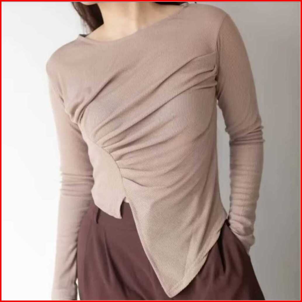 Crop Top Knit Rib Kerut Samping Yoora Top Blouse Lengan Panjang Kekinian Korean Style