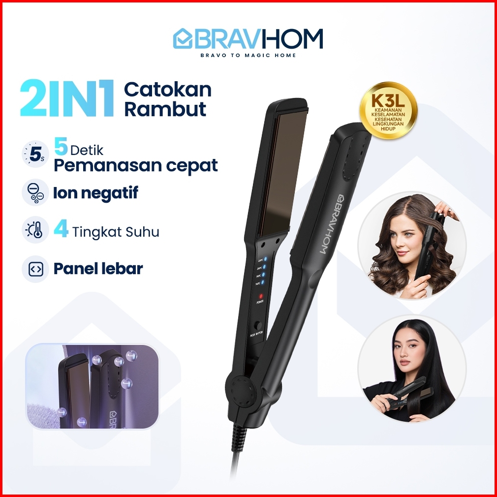 Bravhom Catokan Rambut Lurus Dan Curly 2 In 1 Pemanasan Cepat 5s Ion Negatif Tahan Lama Bl-hs04