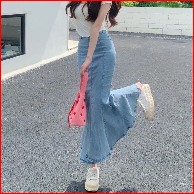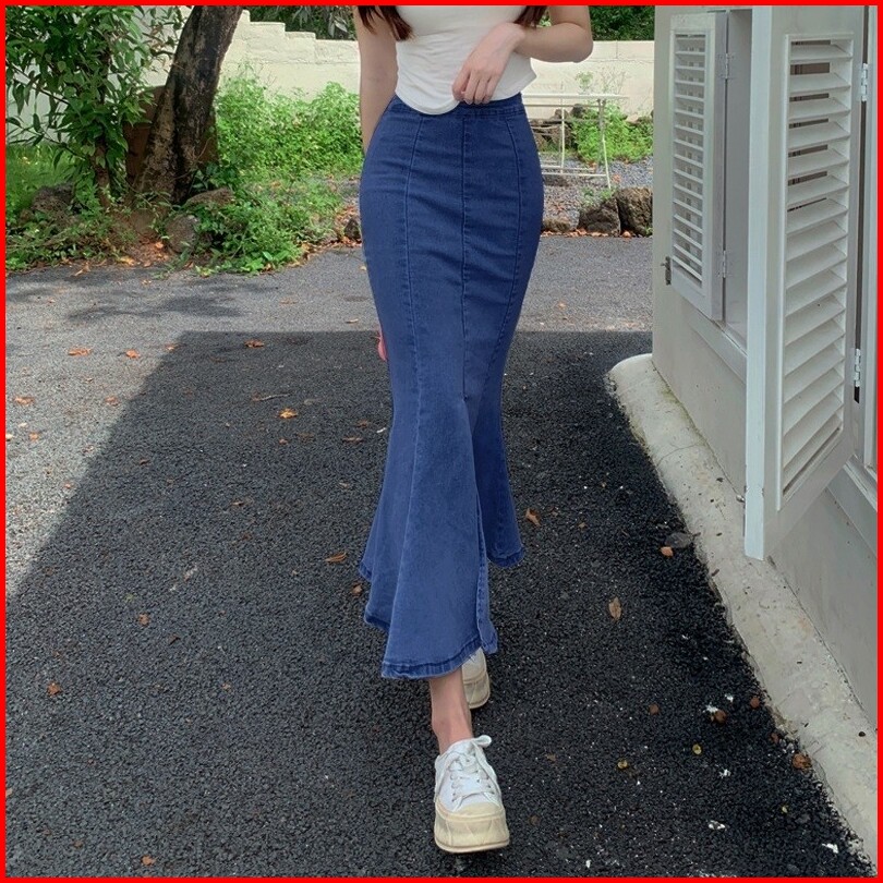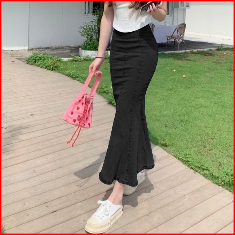 Mermaid Midi Skirt Rok Duyung Jeans Wanita Model Korea Terbaru Kain Jeans Denim Stretchy Melar