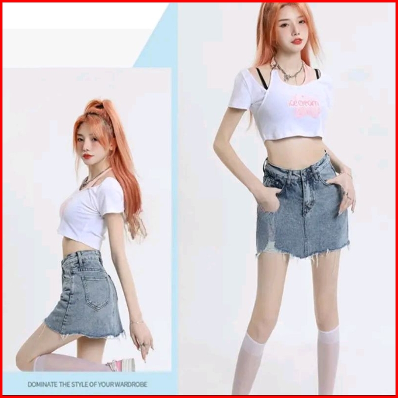 Elegancia Rok Mini Jeans Pendek Wanita Line Korean Style Ripped Cewek Denim Skirt Keren