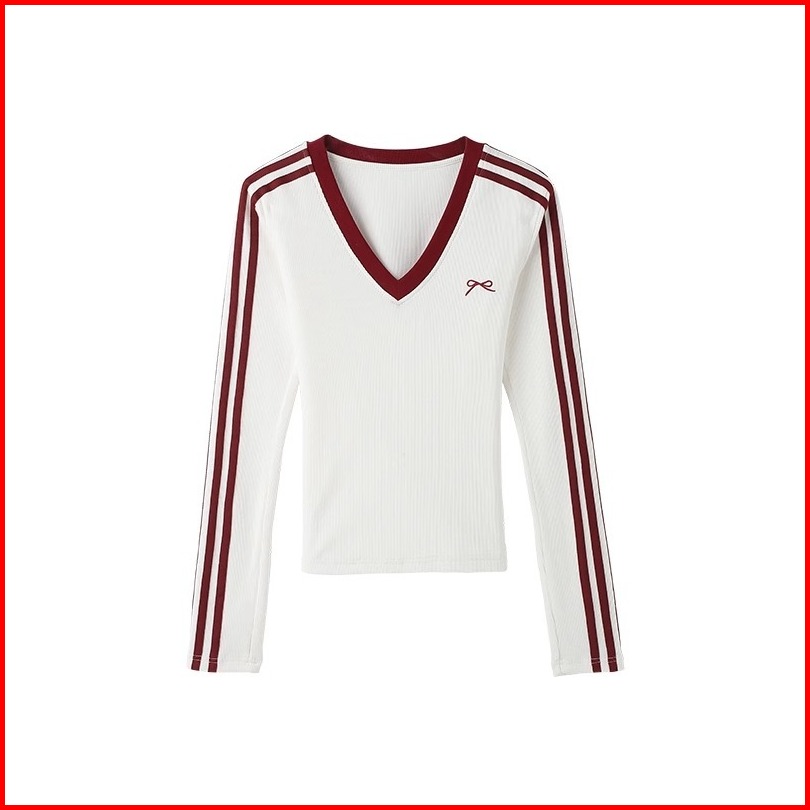 Kaos Rib Lengan Panjang Kerah V Slim Fit Bordir Garis Merah Wanita