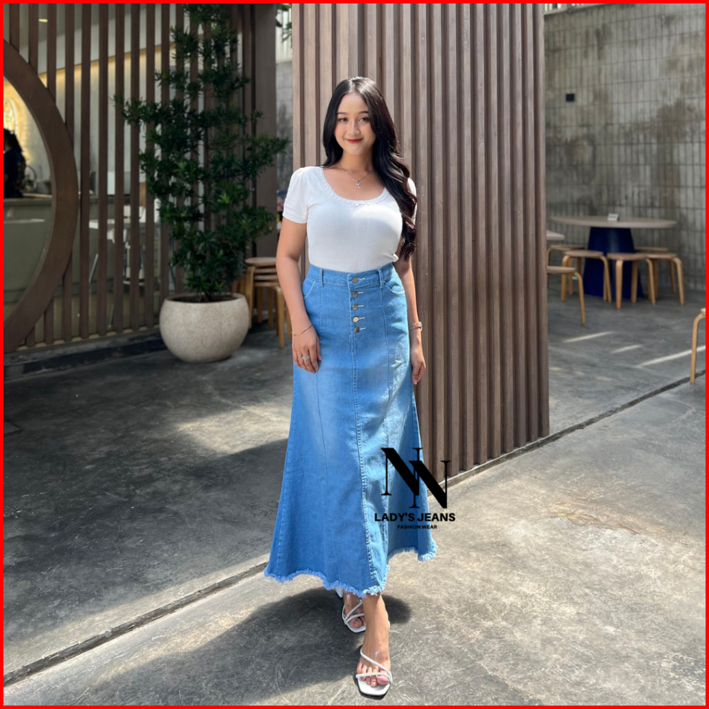 Nn - Highwaist Rok Jeans Mermaid Midi Casual Kancing Super Jumbo 90kg Warna Hitam
