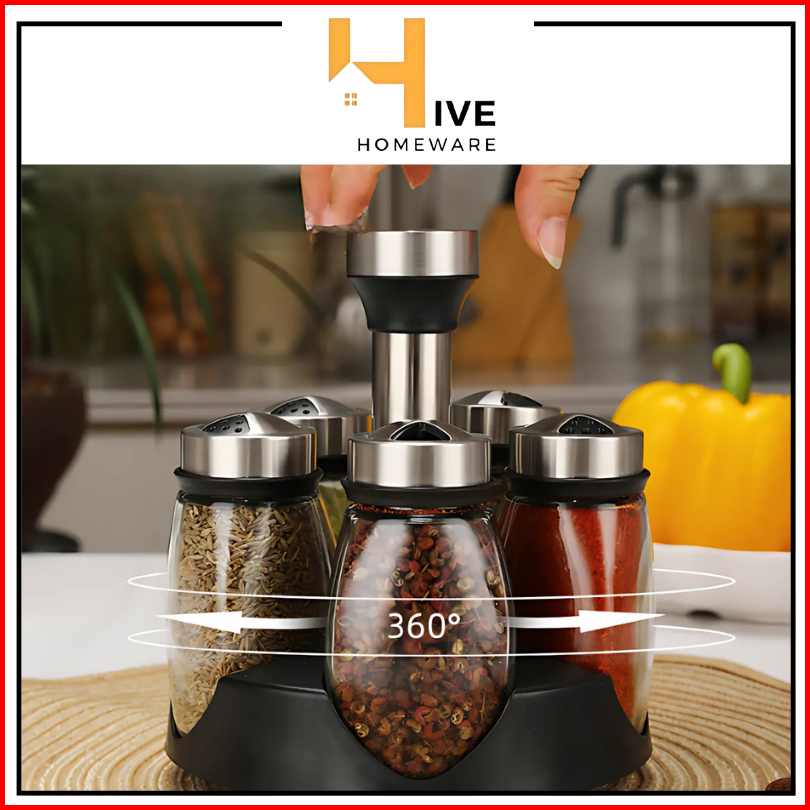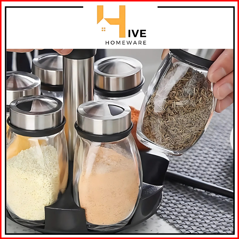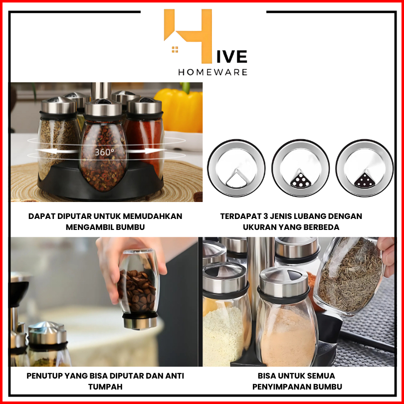 Hive Botol Kaca Tempat Bumbu 1 Set Bisa Diputar Dengan Tutup Stainless Steel