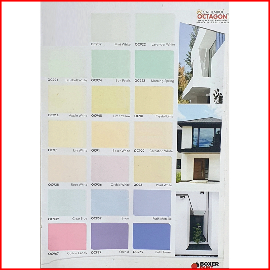 OC Super White, OC Super Black, OC959 Snow, Putih Metallic, OC91 Boxer White, OC92 Cream, OC93 Pearl White, OC94 Beige, OC95 Cafe-Au-Lait, OC96 Chocolate Brown, OC97 Lily White, OC98 Crystal Lime, OC99 Pale Primrose, OC910 Daffodil, OC911 Apricot, OC912 Cornflake, OC914 Apple White, OC915 Lime, OC916 Evergreen, OC917 Eau-De-Nil, OC918 Lime Green, OC919 Chartreuse, OC920 Forest Green, OC921 Bluebell White, OC922 Lavender White, OC923 Morning Spring, OC924 Oasis, OC925 Jade Mountain, OC926 Reef Encounter, OC926A Turquoise, OC927 Orchid, OC928 Rose White, OC929 Carnation Whit, OC930 Sand Dune, OC931 River Rock, OC932 Silver Grey, OC933 Carnation, OC934 Coral Pink, OC935 Perfect Spice, OC936 Orchid White, OC937 Mint White, OC938 Ash Grey, OC939 Clear Blue, OC940 Crystal Blue, OC941 Mist Blue, OC942 River Fountain, OC943 Salmon Orange, OC944 Brick Red, OC945 Lime Yellow, OC946 Valley Flower, OC947 Regency Cream, OC948 Sunrise, OC949 Melted Butter, OC950 Summer Daffodi, OC951 Banana Peel, OC952 Corn Harvest, OC953 Hot Sun, OC954 Avocado, OC955 Wasabi, OC956 Mantis Green, OC957 Palm Tree, OC958 Vegetation, OC960 Fresh Cut Gree, OC961 Fisherman Gree, OC962 Caribean Cruis, OC963 Mountain Blue, OC964 Ocean Blue, OC965 Pacific Ocean, OC966 Deep Sapphire, OC967 Cotton Candy, OC968 Love Letter, OC969 Bellflower, OC970 Tile Red, OC971 Dark Rock, OC973 Smoke Grey, OC974 Soft Petals, OC979 Flag Red