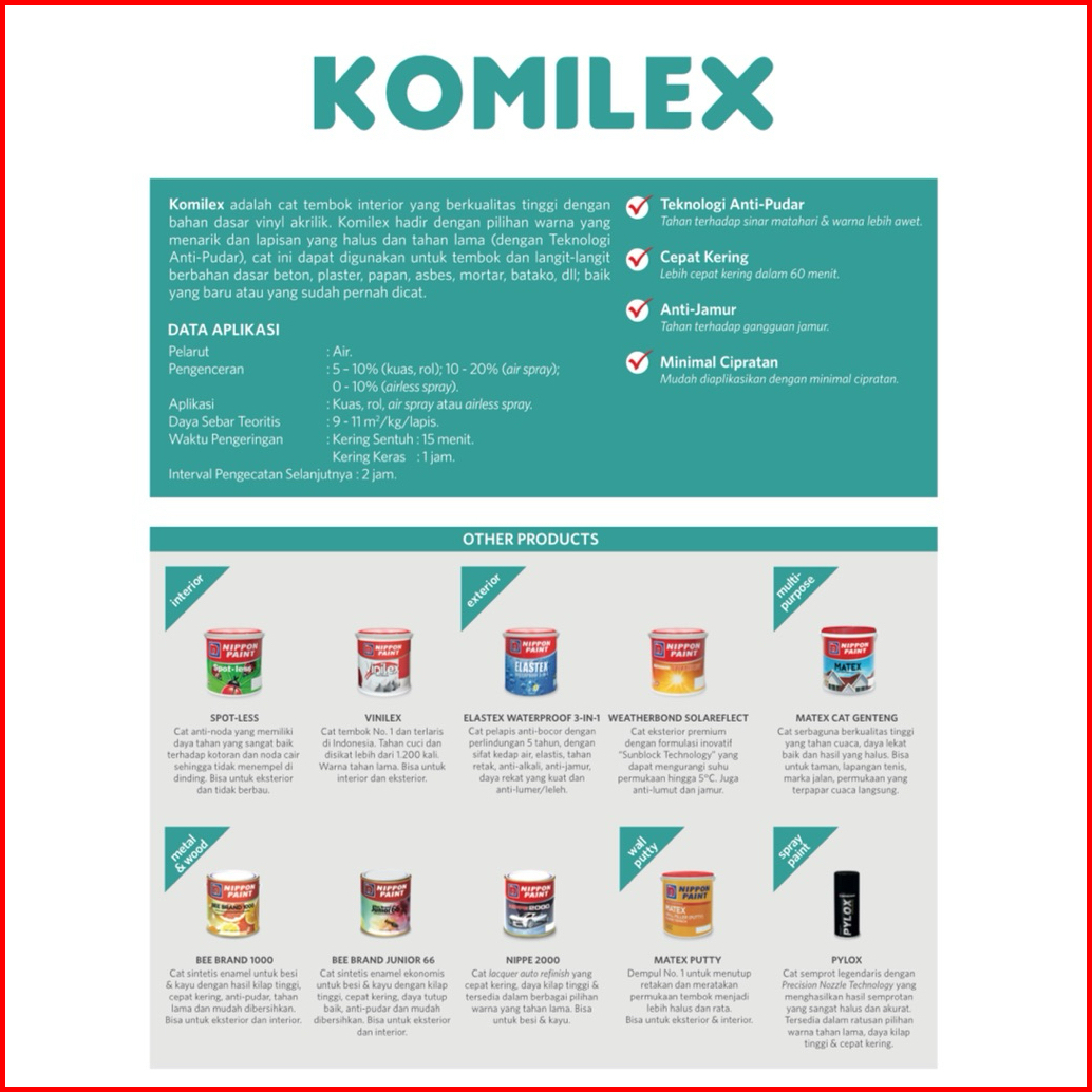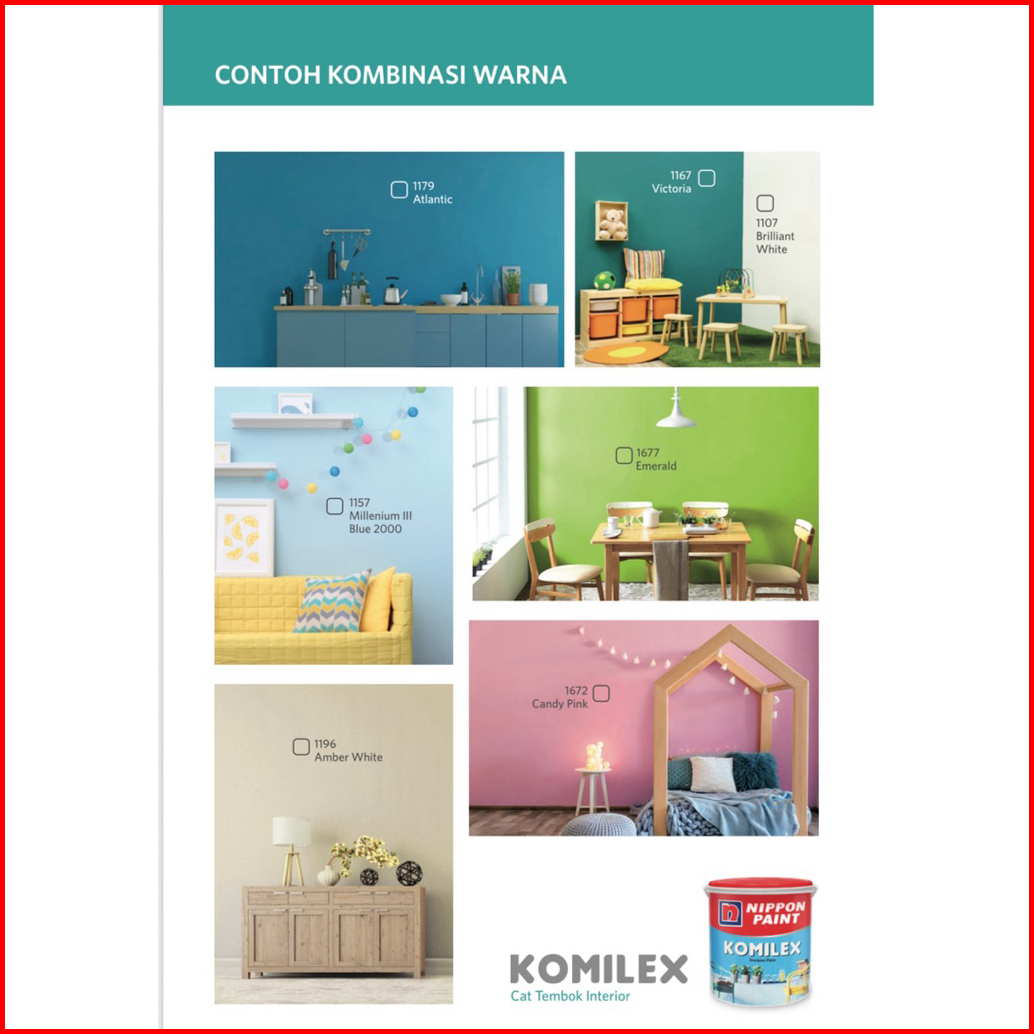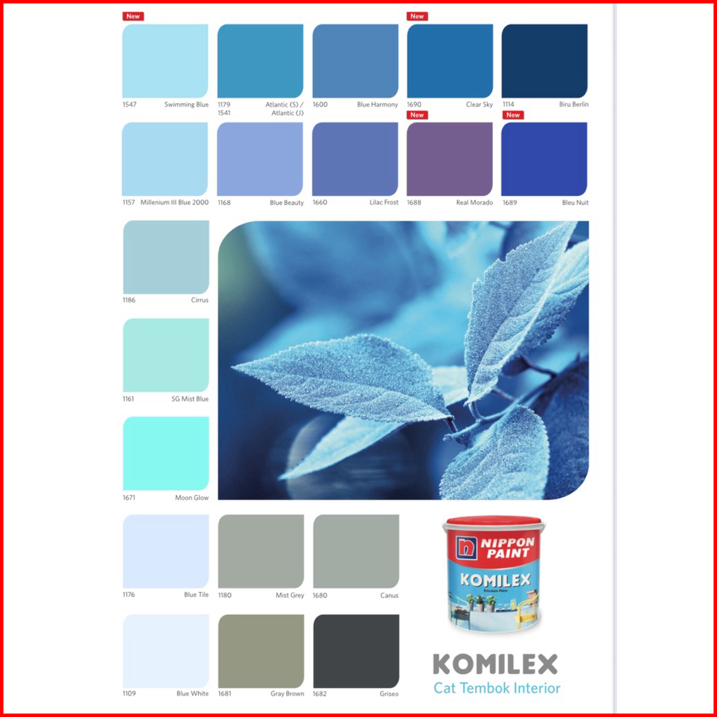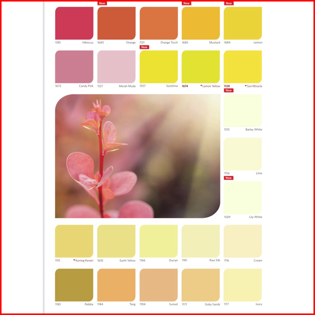 1672 Candy pink, 1127 Merah Muda, 1131 Orange Torch, 1674 Lemon Yellow, 1128 Sun Miracle, 1185 Hibiscus, 1509 Lily White, 1610 Earth Yellow, 1183 pebble, 1184 Tang, 1104 sunset, 1166 Durian, 1181 Ray Silk, 1116 Cream, 1117 Ivory, 1171 Goby sands, 1677 Emerald, 1620 Apple Green, 1676 fresh Mint, 1657 Bright Green, 1178 green freeway, 1191 Tosca, 1167 victoria, 9103 Black, 1102 White, 1107 Briliant white, 1109 Blue White, 1108 Extra White, 1154 Hijau Telor, 1153 Hijau Segar, 1197 Grass Green, 1159 Carnation White, 1196 Amber White, 1192 Merry white, 1129 Peach, 1126 Blewah, 1182 Coral Blush, 1158 Terracotta, 1189 Coral Red, 1547 Swimming Blue, 1157 Millenium III, 1168 Blue Beauty, 1600 Blue Harmony, 1660 Lilac Frost, 1688 Real Morado, 1186 Cirrus, 1161 SG Mist Blue, 1671 Moon Glow, 1176 Blue tile, 1180 Mist Grey, 1680 Canus, 1681 Gray Brown, 1682 Gruseo, 1198 Lome fizz, 1160 beauty green