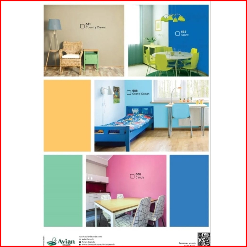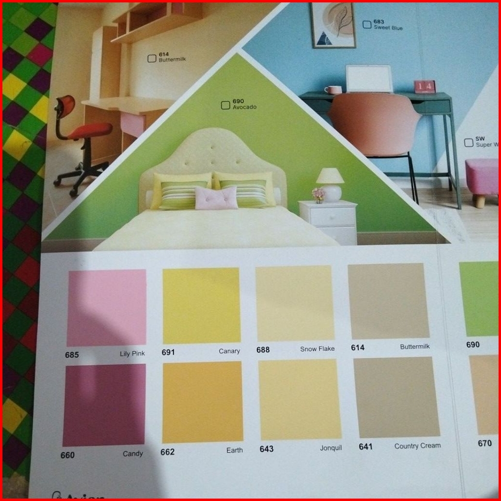 SW (Super White), MW (Metro White), 694 Abu-abu, 685 Lily Pink, 691 Canary, 688 Snow Flake, 614 Buttermilk, 660 Candy, 662 Earth, 643 Jonquil, 641 Country Cream, 690 Avocado, 680 Green Tea, 681 Cool Dream, 683 Sweet Blue, 670 Ivory, 661 Leafy, 686 Grand Ocean, 663 Azure