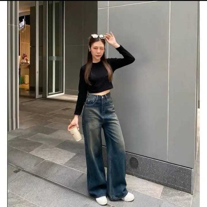 Celana Highwaist Baggy Loose Jeans Kulot Wanita skena Kekinian - Celana Wisker Korean Style
