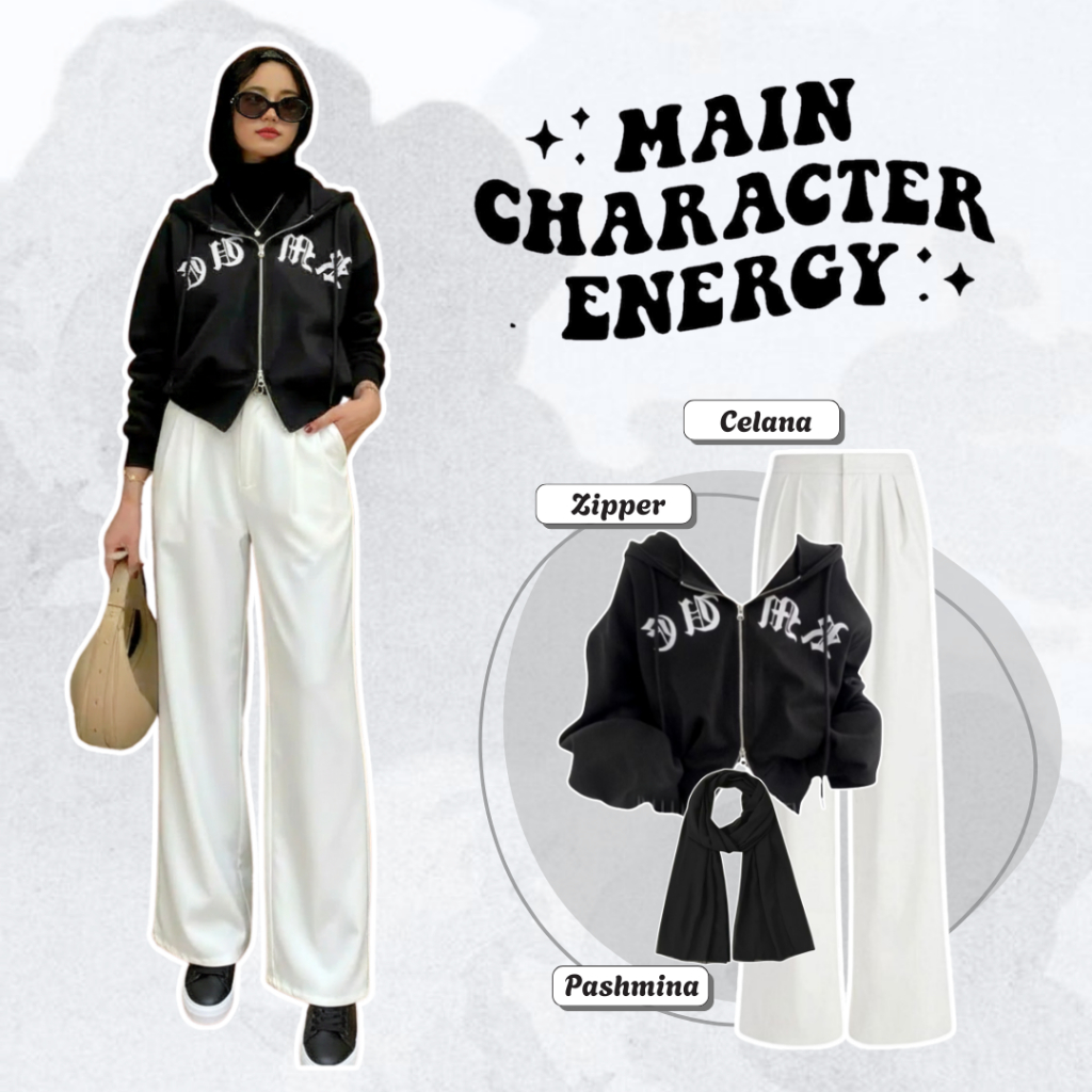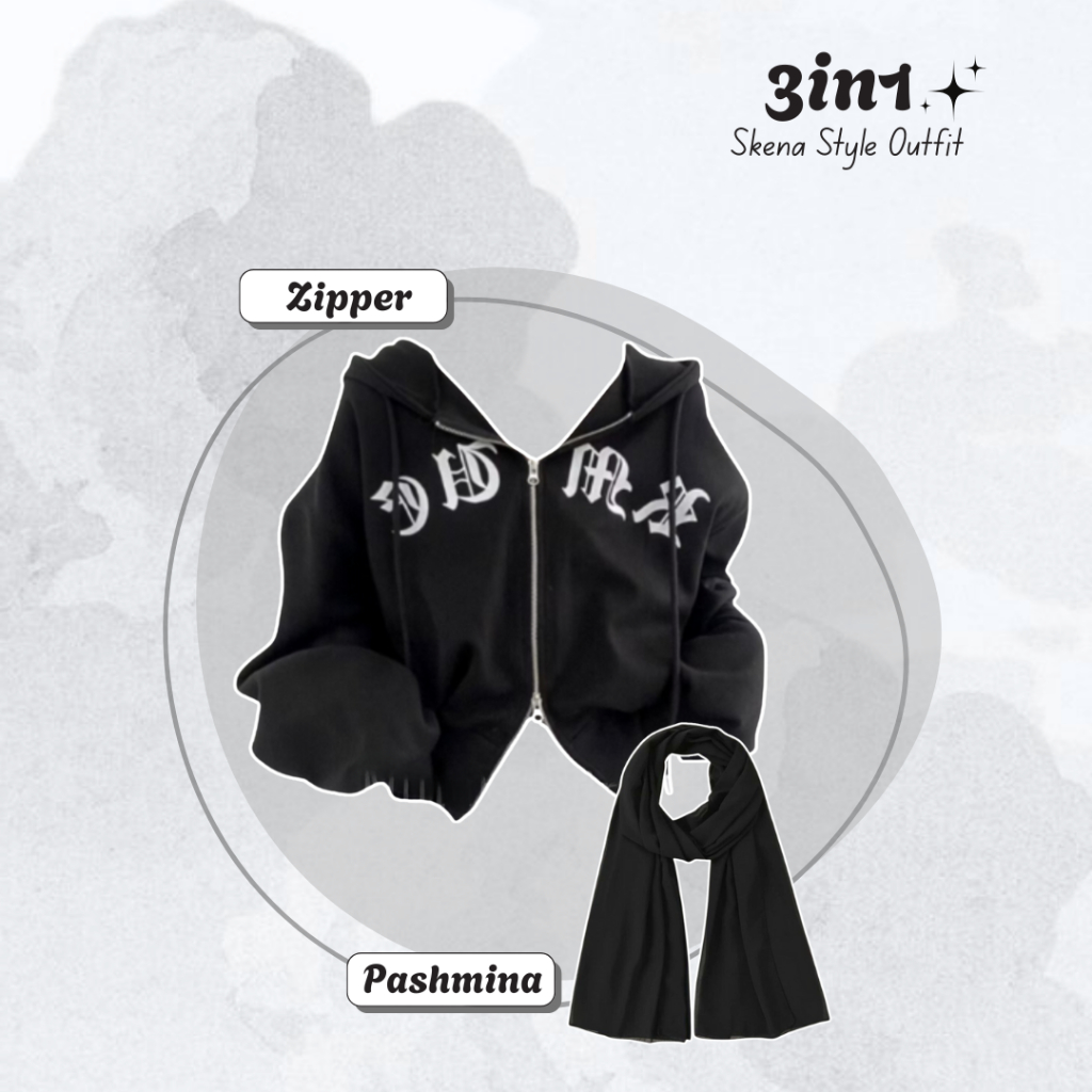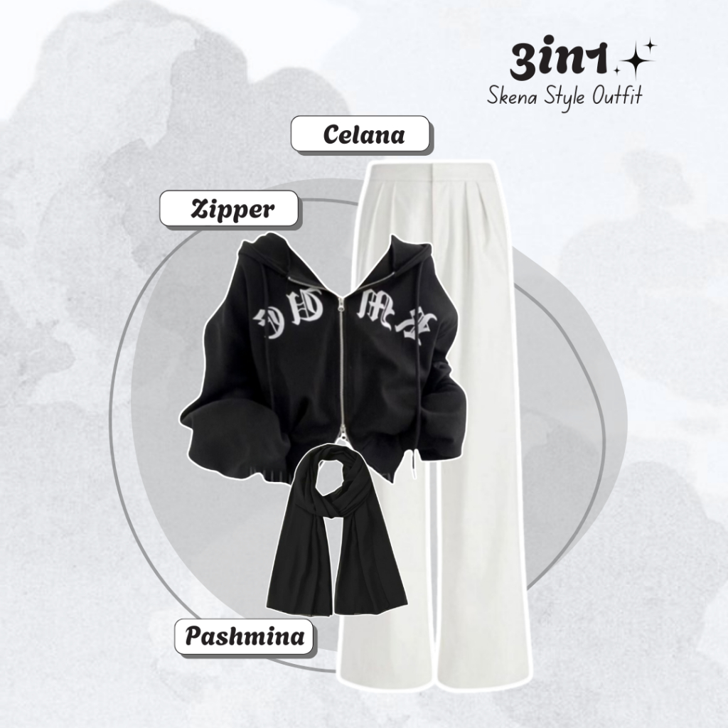 Setelan Skena Outfit Wanita (Zipper Sweater + Celana Kulot Wanita + Pashmina Ceruty Hitam) || OOTD Skena Cewek Hijab Out
