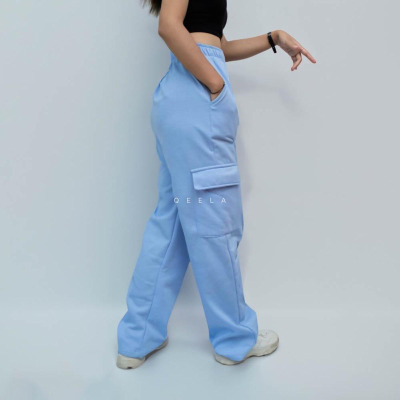 Celana Cargo Wanita Bahan Fleece Pinggang Full Karet 4 Saku Aktif || Sweatpants Cargo