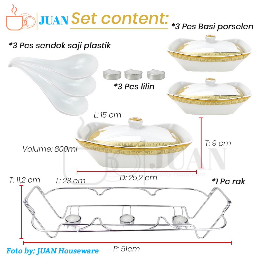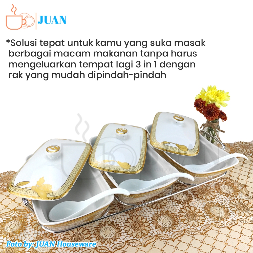 VICENZA Prasmanan segi set keramik isi 3 + tutup + rak motif lily / casserole / wadah saji porselen B-751