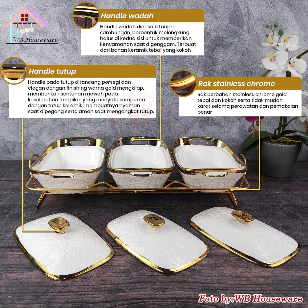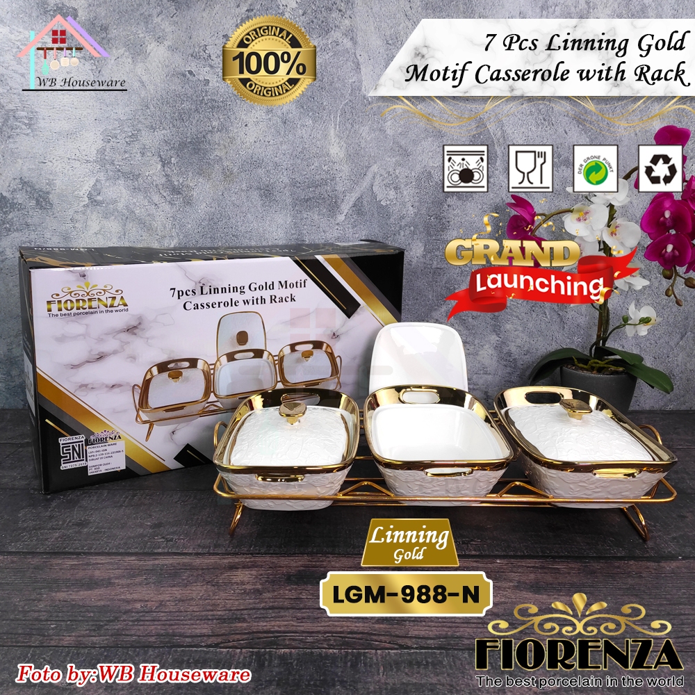 FIORENZA 7pcs prasmanan set segi + tutup + rak motif linning G0.LD series keramik LGM-988N / premium casserole set with rack / food warmer