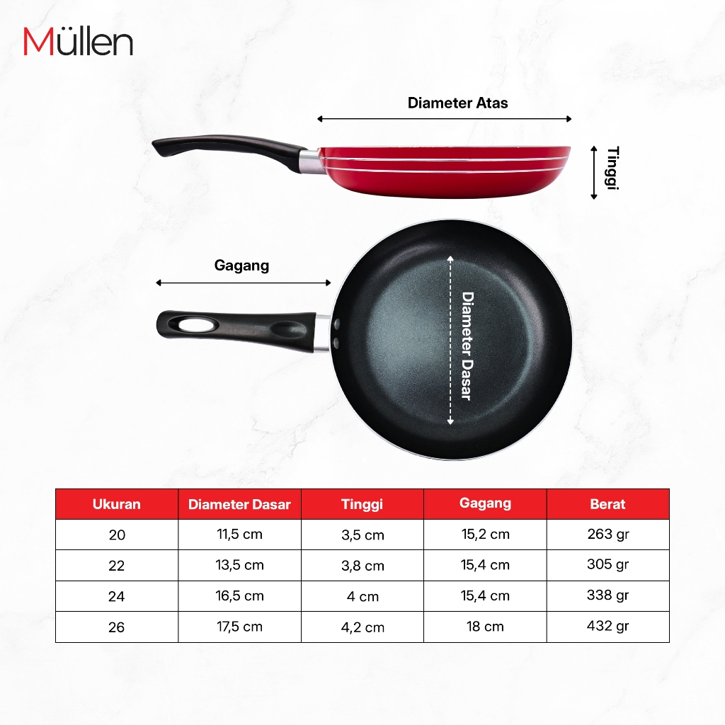 Mullen Fry Pan Red Teflon Wajan Penggorengan Anti Lengket Kitchenware Frypan Stainless Non Stick Gagang Bakelite 20/22/2