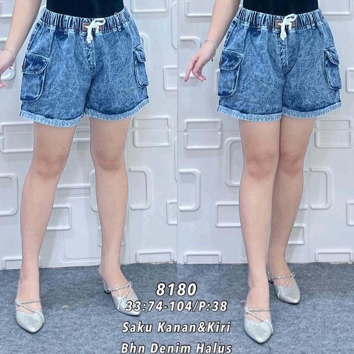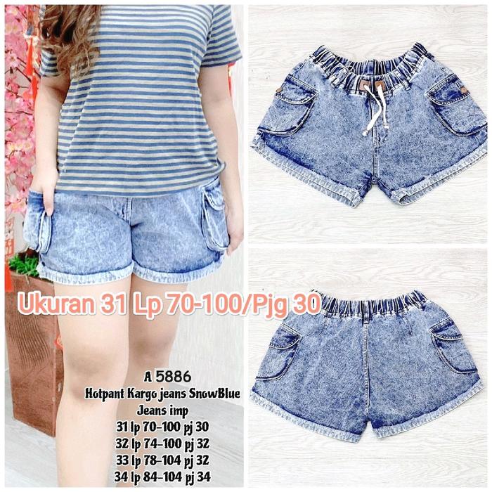Celana Jeans Hotpants Cargo Snow Blue Pinggang Karet Tali Kaki Stik Size 27-34 Wanita Motif Kantong - Snow Blue 27
