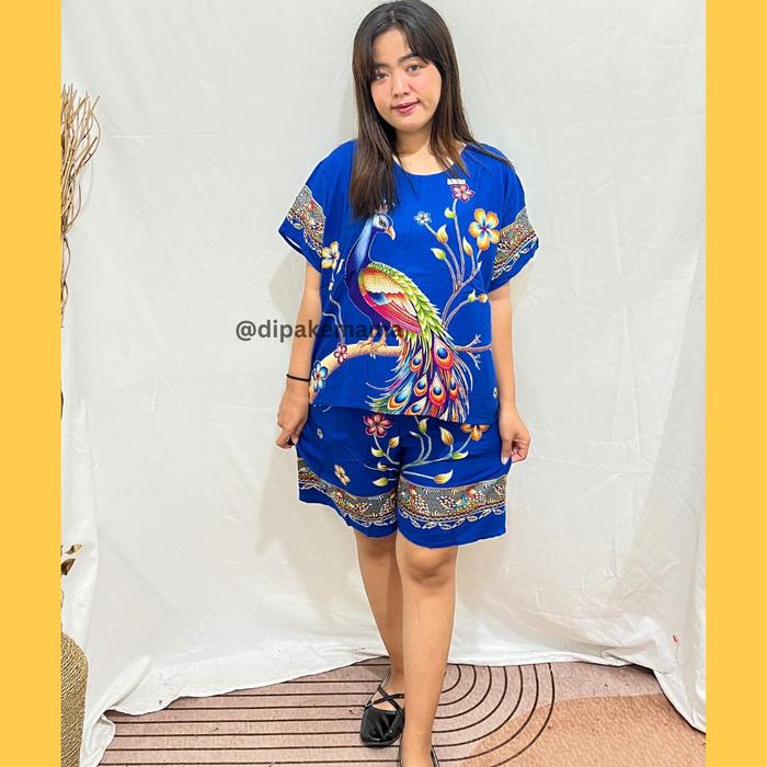 SETELAN HOTPANTS LEHER BULAT MOTIF BATANG MERAK LD MAKSIMAL 125cm [DPKMM] - BIRU