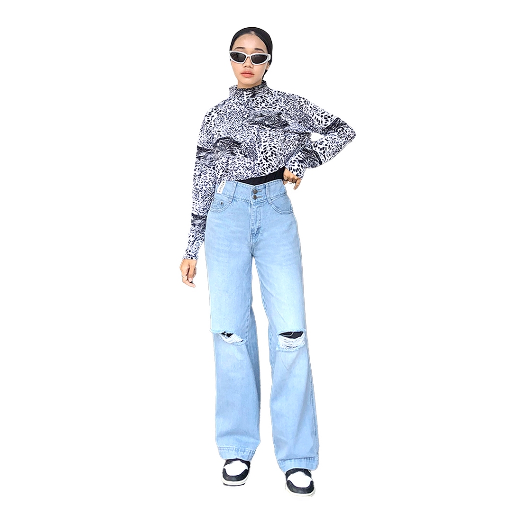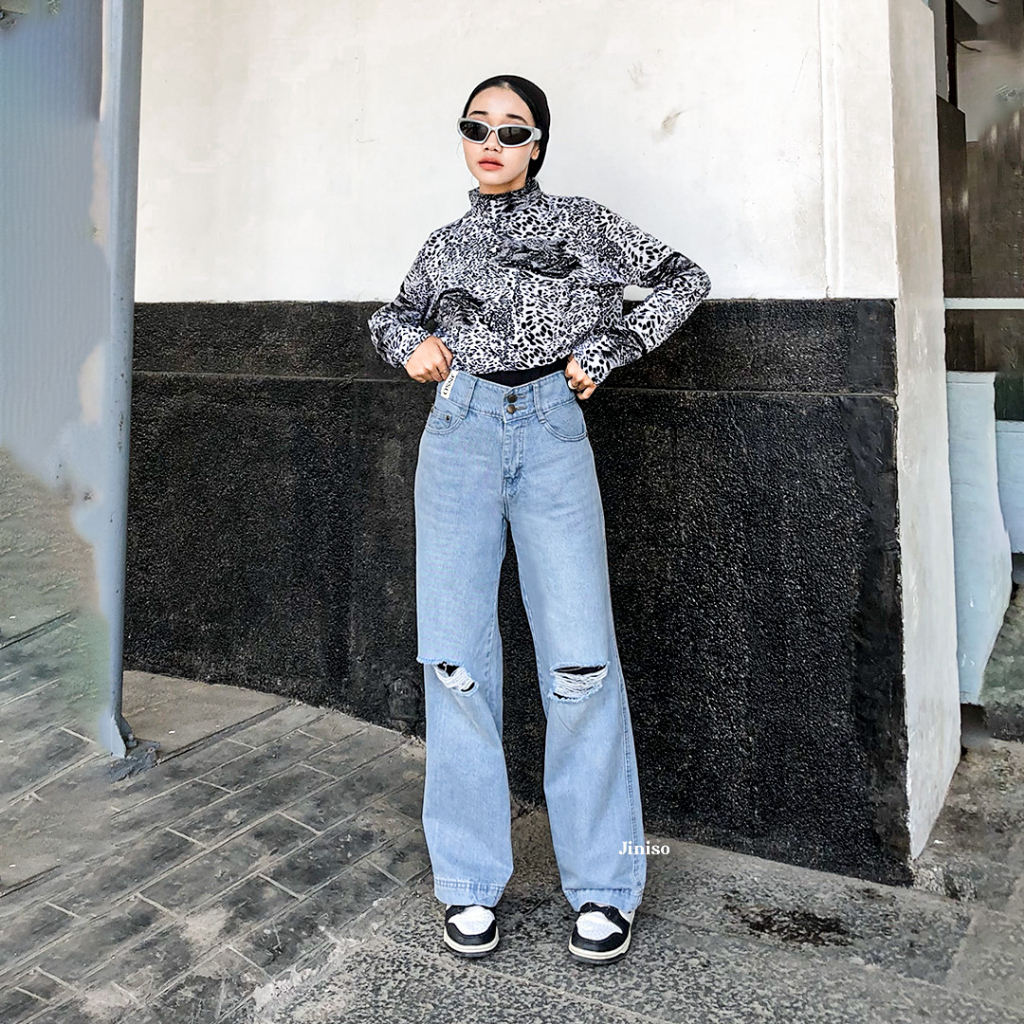 Celana Jeans Wanita Highwaist Baggy Ripped Mystic Gal Jiniso Nyaman Stylish Cocok Santai Aktivitas Modern