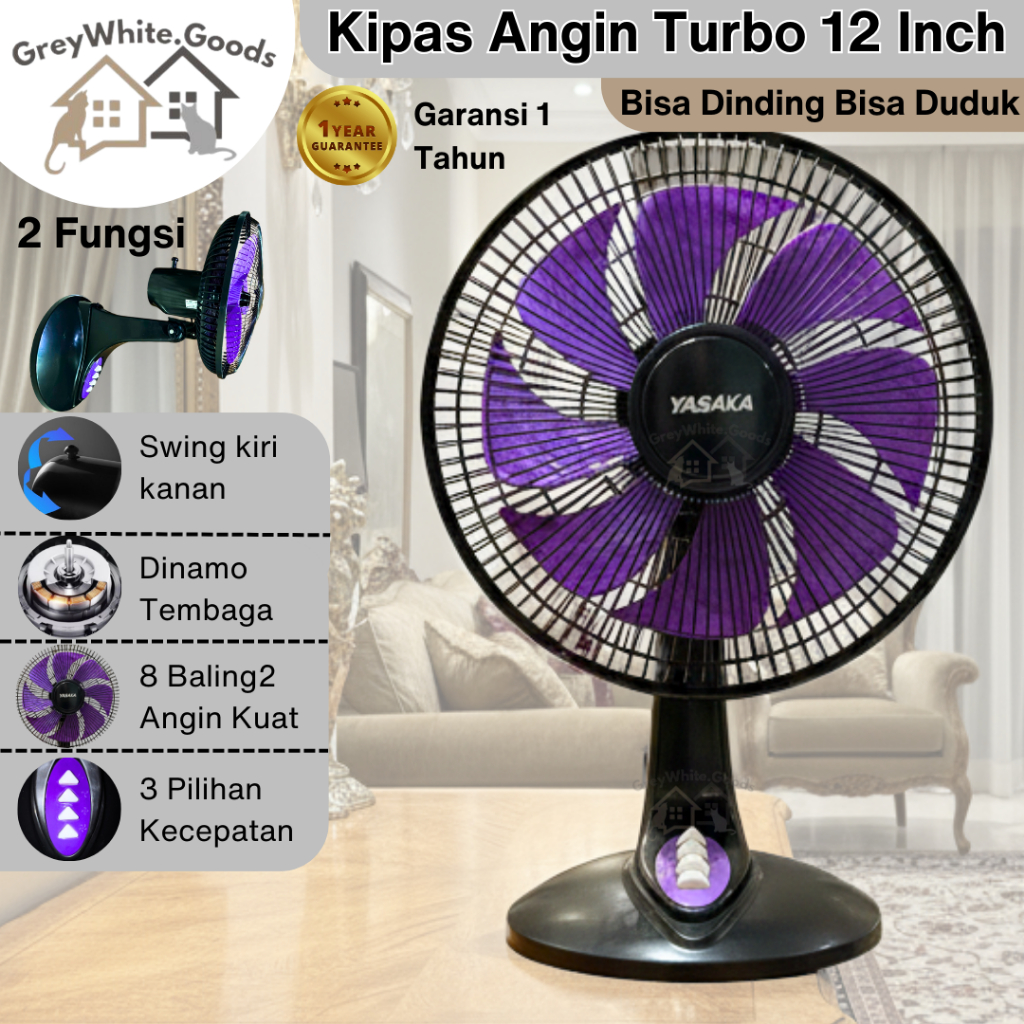 Kipas Duduk Dinding 12 Inch Turbo 2in1 8 Baling 3 Kecepatan Bergaransi