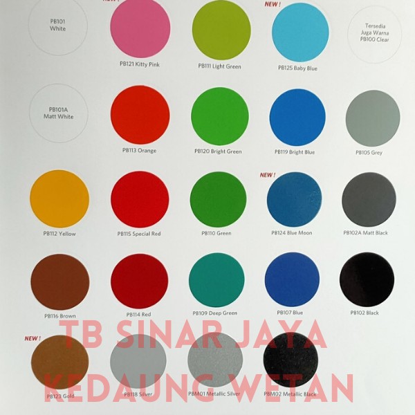 PBM-01 METALIC SILVE, PBM-02 METALIC BLACK, PB 100 CLEAR, PB 101 WHITE, PB 101 A WHITE MATT, PB 102 BLACK, PB 102 A BLACK MATT, PB 105 GREY, PB 107 BLUE, PB 109 DEEP GREEN