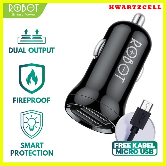 Car Charger Robot RtC07 Dual Output Original Free Kabel Micro Usb Garansi Resmi 1 Tahun