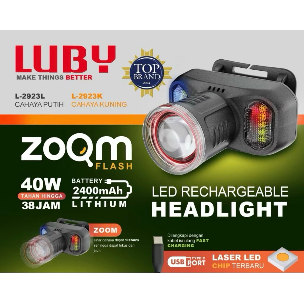 SENTER KEPALA LUBY 65W LASER LED ZOOM L-2906NL L-2906NK L-2905NL L-2925 TAHAN LAMA WATERPROFF 4800mAh 48 JAM