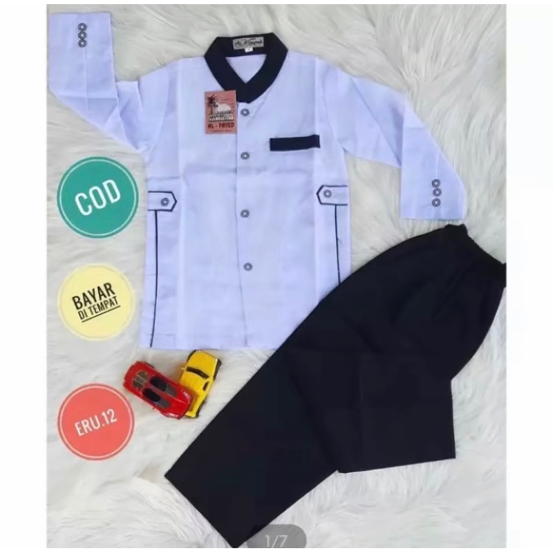 Setelan baju koko putih jasko free peci model saku bobok kain katun tangan panjang sangat nyaman celana hitam free peci variasi kancing depan terbaru 2025/ setelan koko manasik anak laki laki terbaru