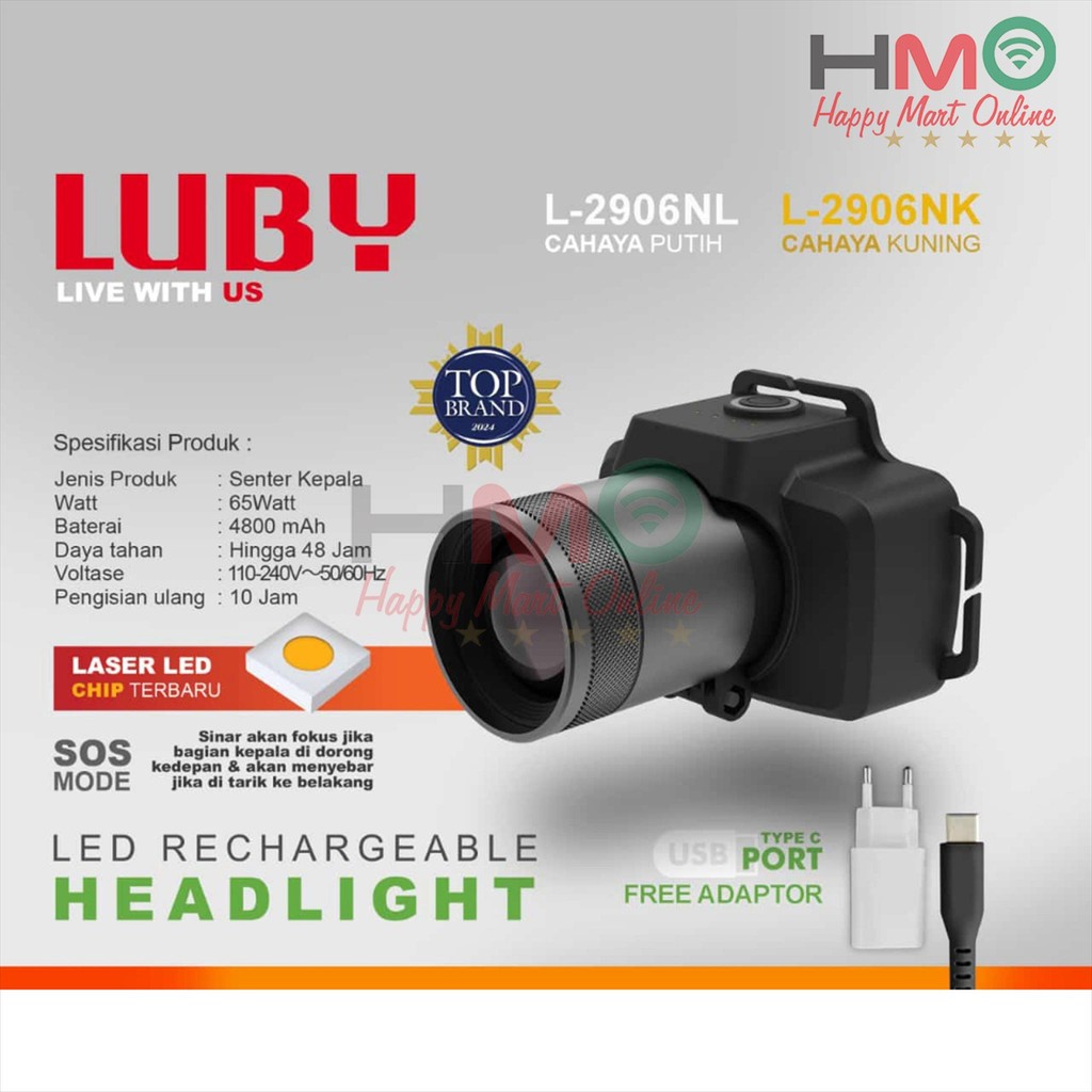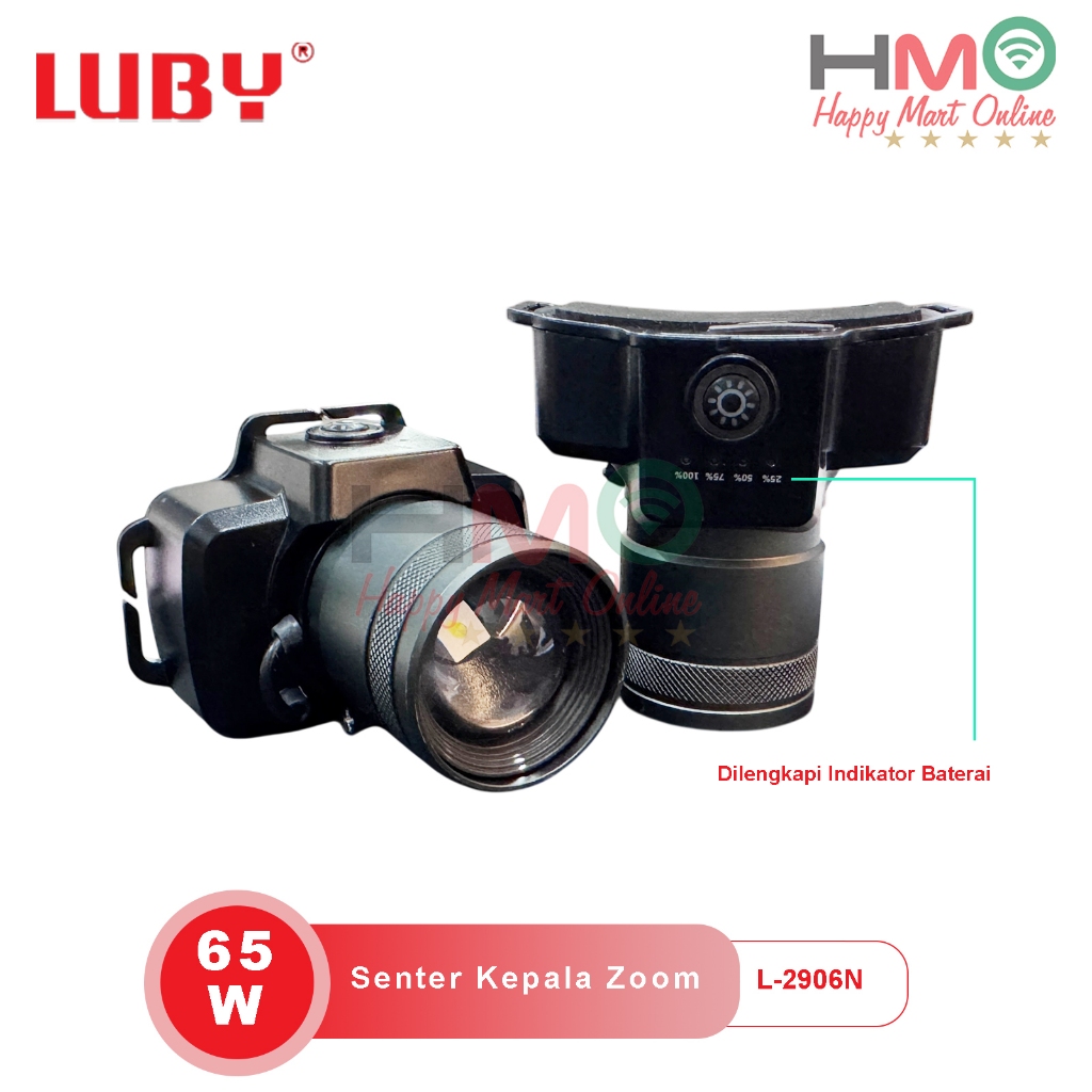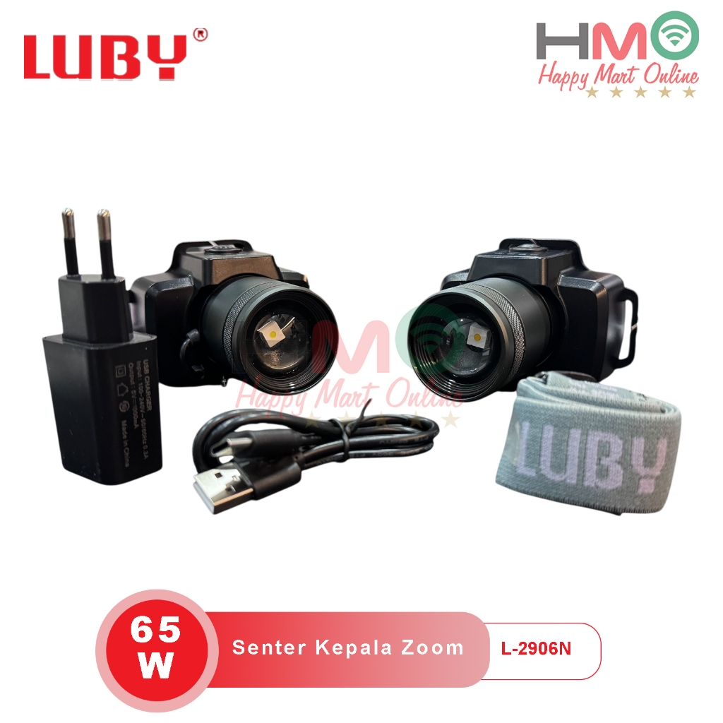 LUBY Senter Kepala Zoom Anti Air 2906NL 65 W Cahaya Putih Kuning Headlamp 65 Watt Luby L-2906NK