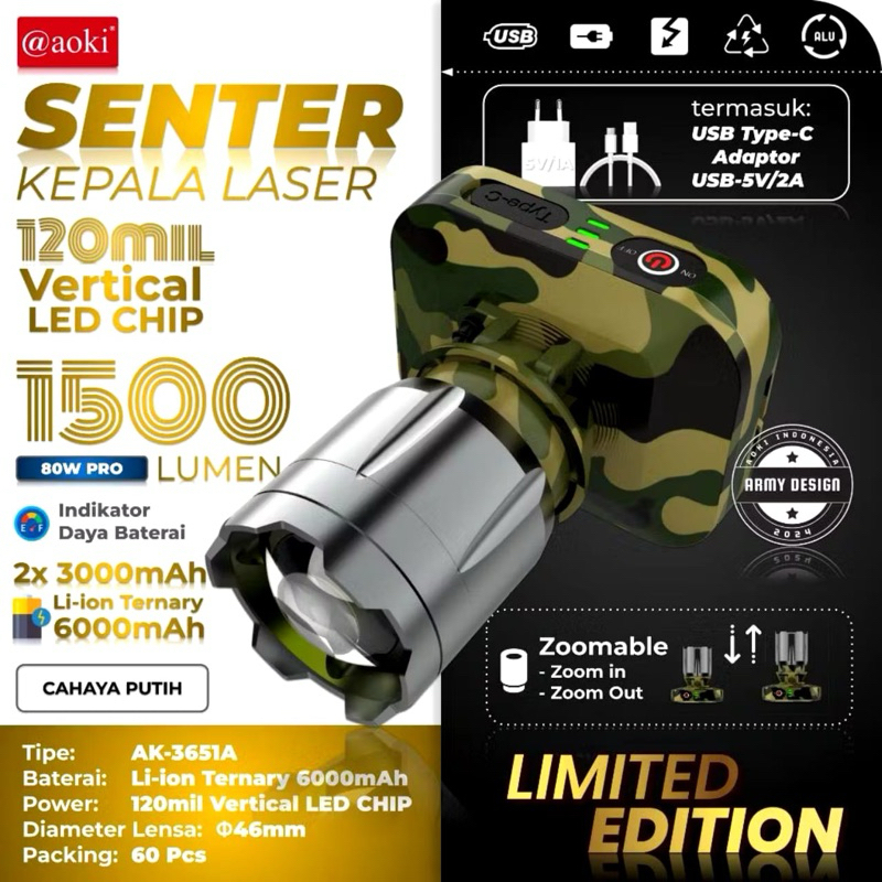 Senter Kepala Cas Aoki 80w 6000mAh LED Laser Zoom in out 3 Mode Super Terang