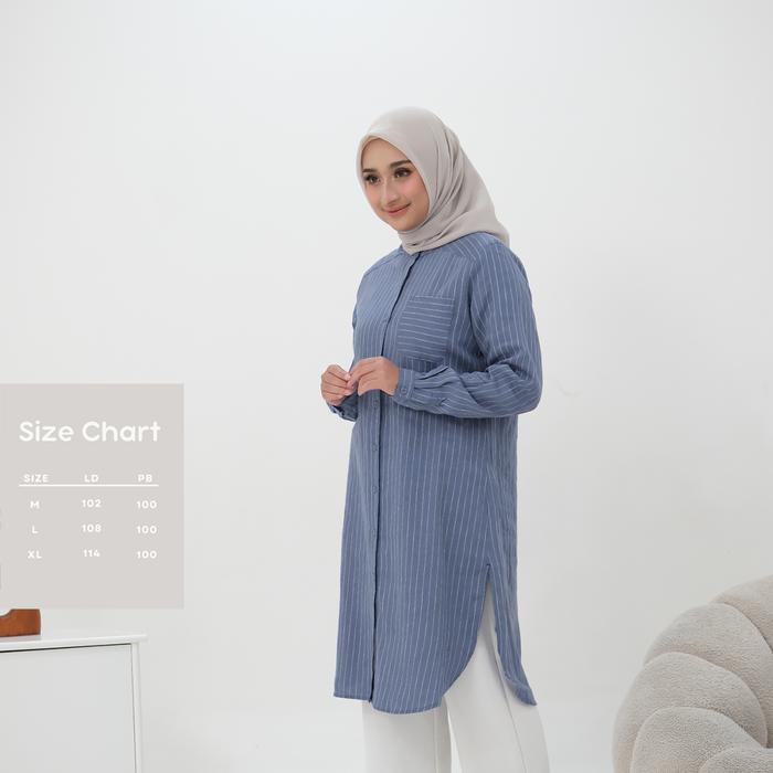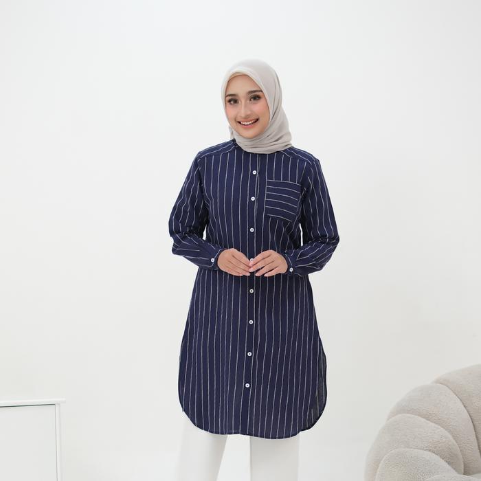 Tunik Streep Wanita Terbaru Katun Linen Import Kancing full - denim + white M