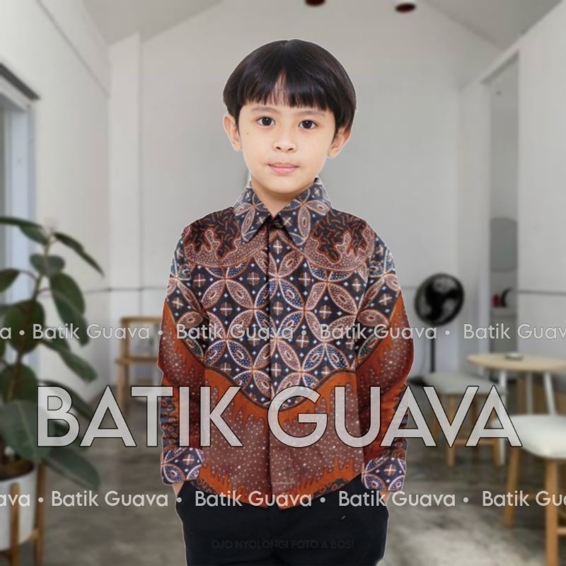 BATIK GUAVA - TERBARU Couple sweet Batik Ayah dan Anak Laki laki Warna TERAKOTA/ JINGGA / MERAH BATA - Kemeja series Motif KAWUNG TERAKOTA