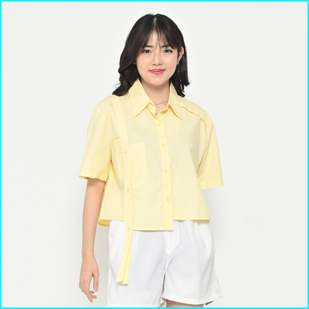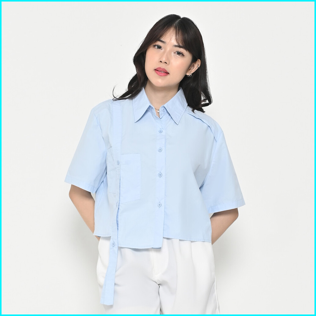 Queentin Kemeja Wanita Asimetris 1166 Cotton Wash Polos Lengan Pendek