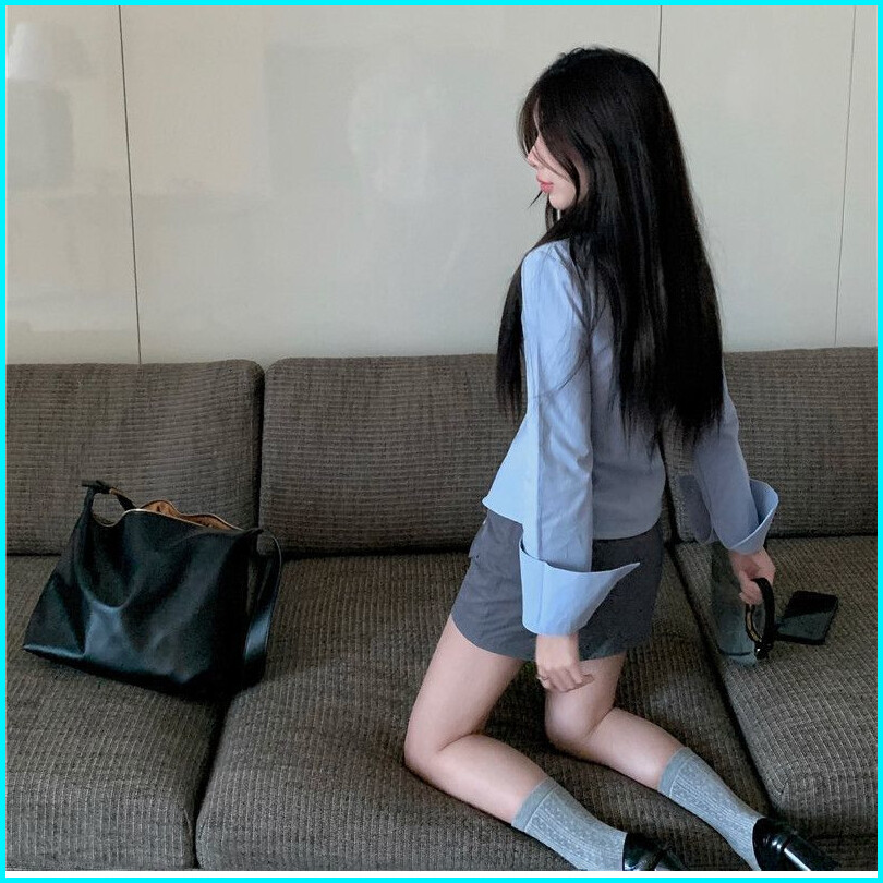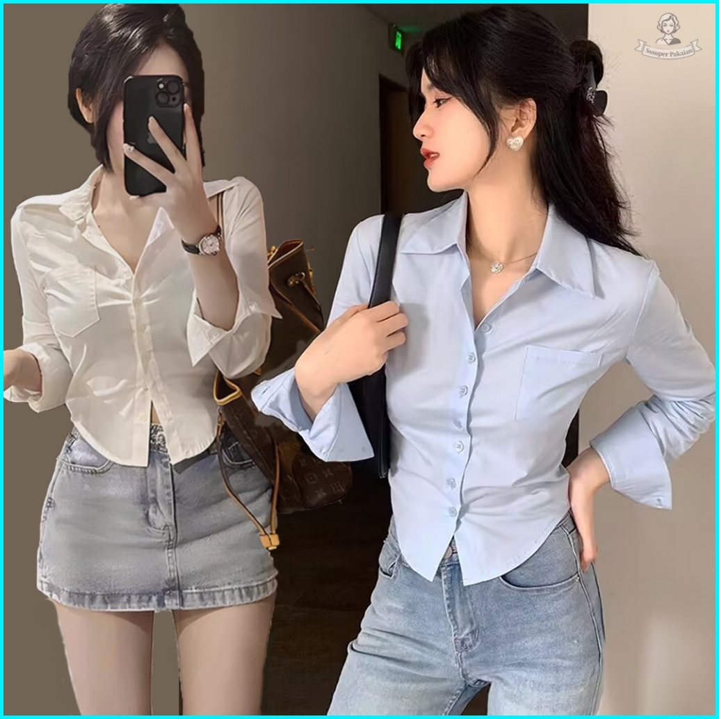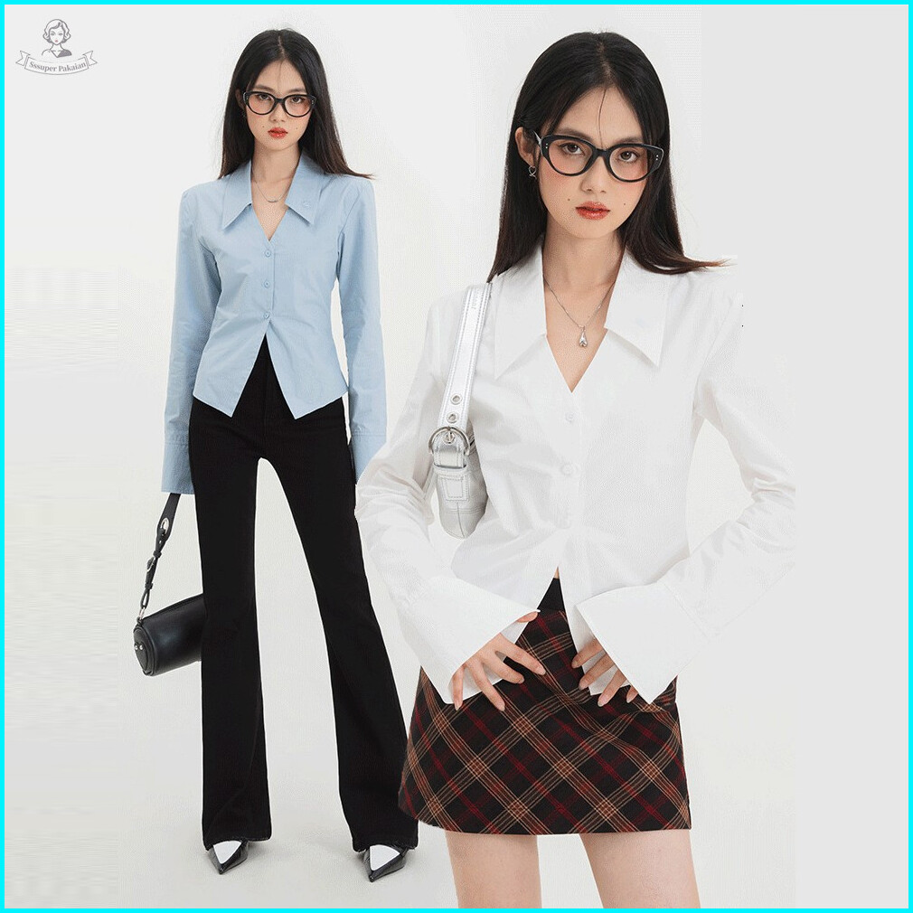 Kemeja Wanita Slim Fit V-neck Gaya Korea Atasan Kemeja Lengan Panjang Pinggang Gaya Terbaru