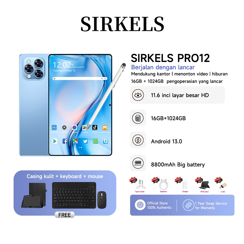 SIRKELS Tablet Pro12 RAM 16GB + 1024GB ROM 5G Dual SIM Wifi Layar 8800Mah Full Screen 11.6in