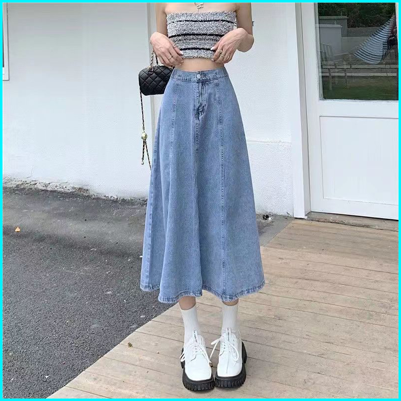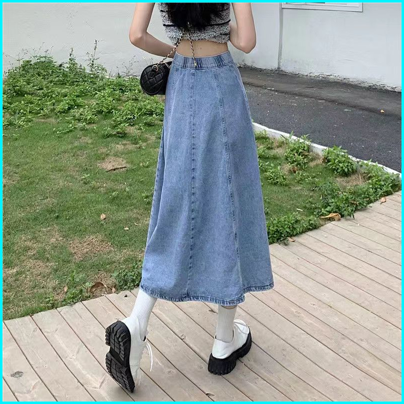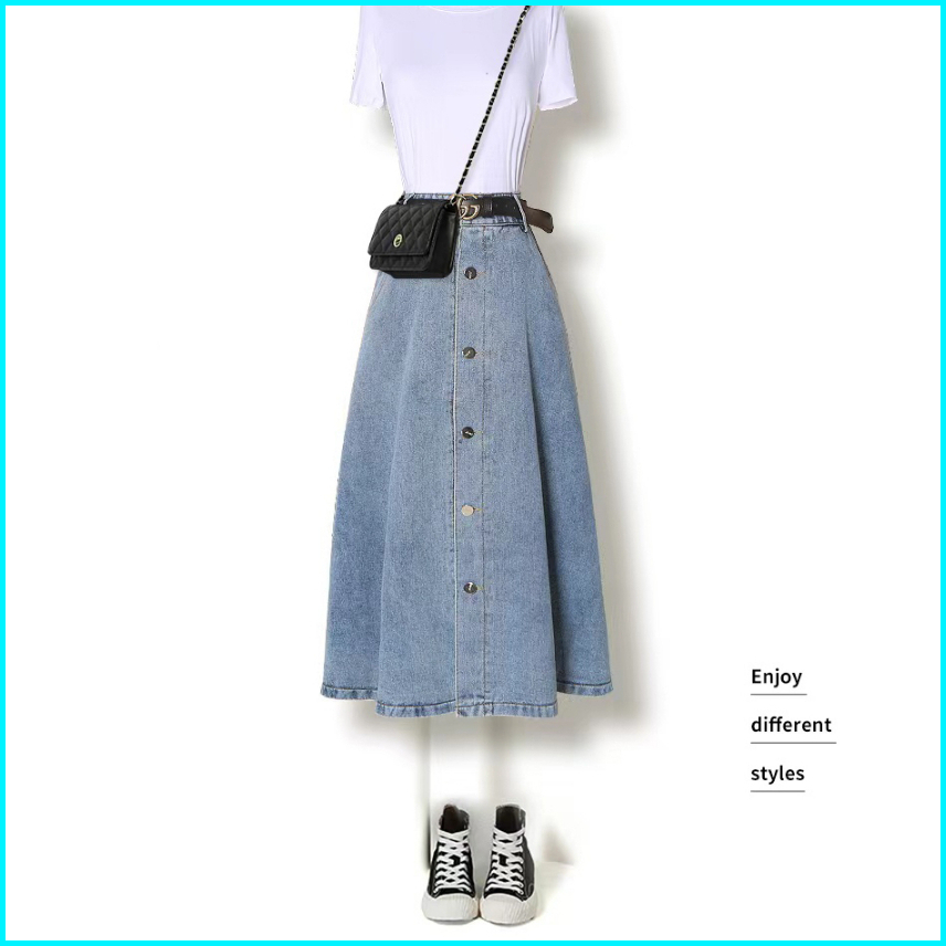 Wanita Idrok Kancing Rok Plisket Rok Korean Style Rok Midi Rok Denim Panjang Rok High Waist Rok Jumbo