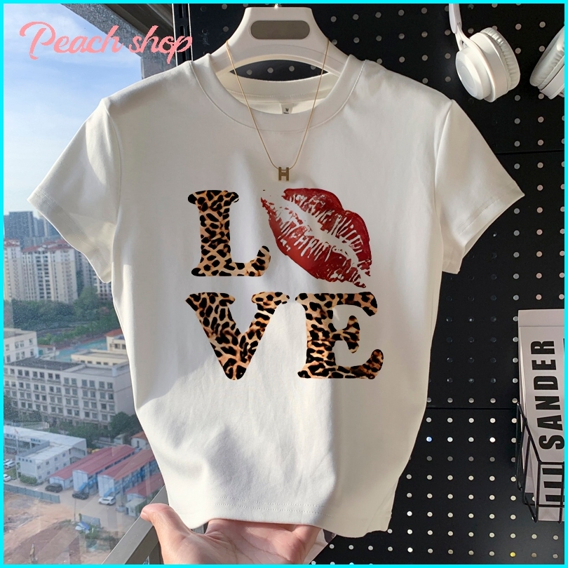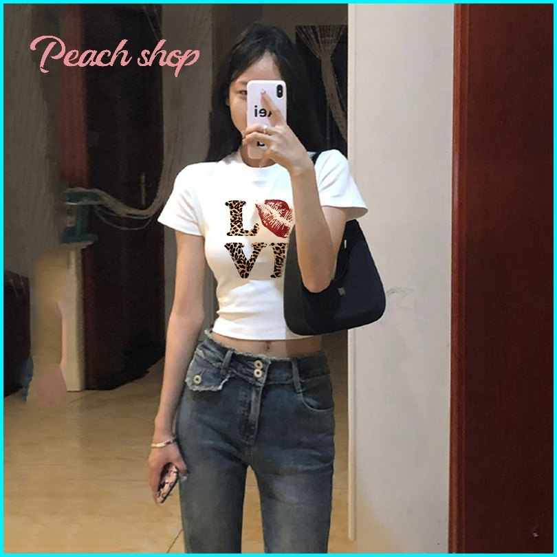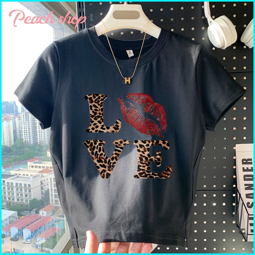 Peach Fashion Macan Tutul Love Kaos Crop Top Wanita Y2k Baju Croptee Korea
