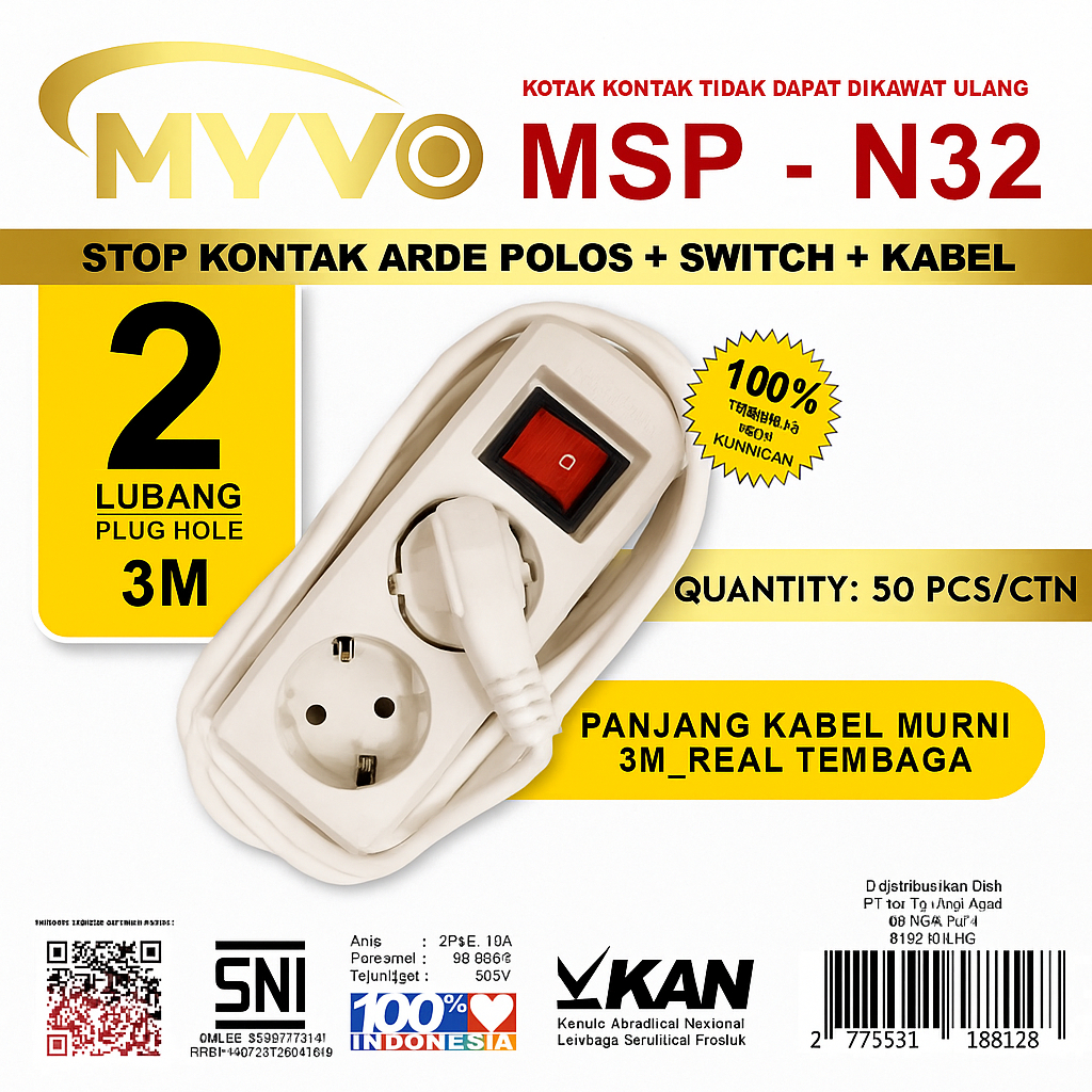 STOP KONTAK KABEL 2 LUBANG 1.5M/3M/5M PUTIH SNI - STOP KONTAK MYVO 2 LOBANG