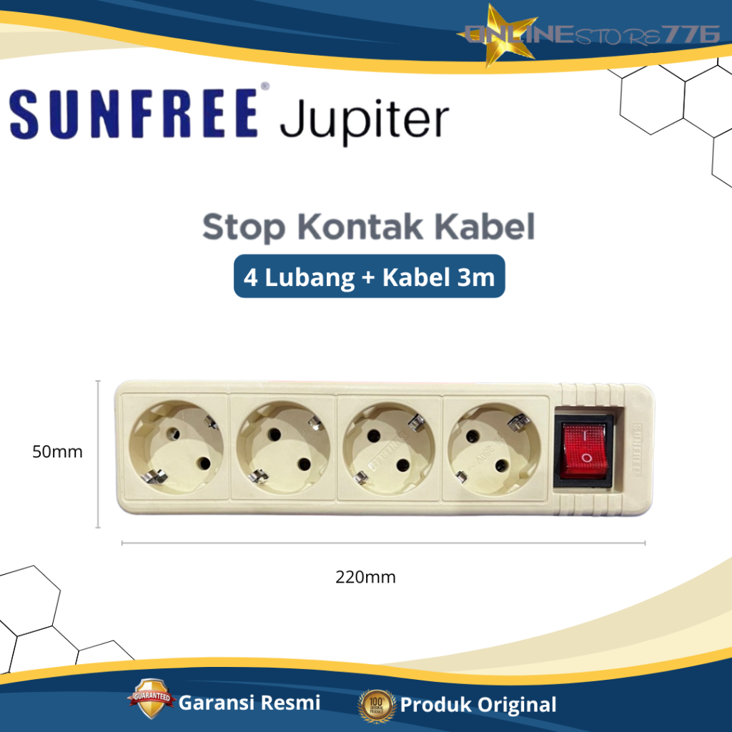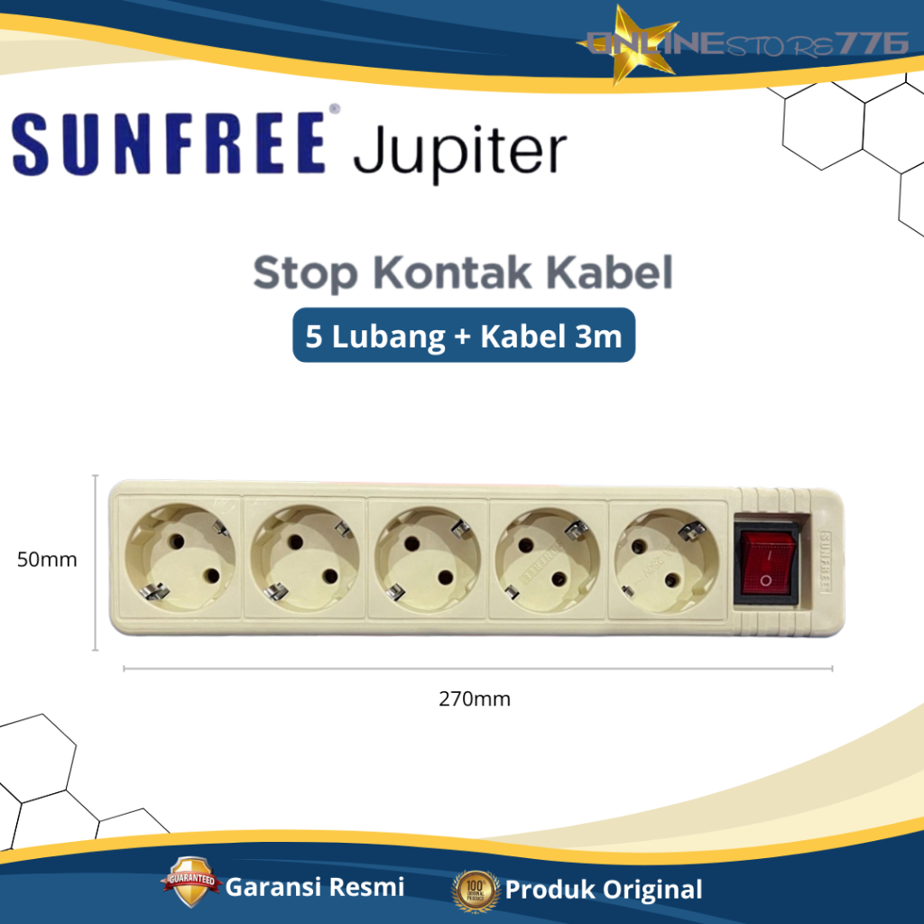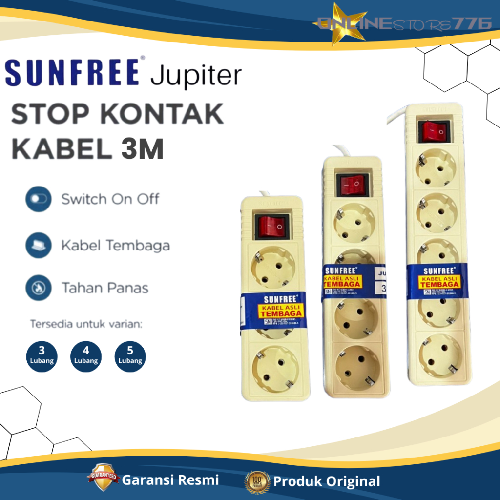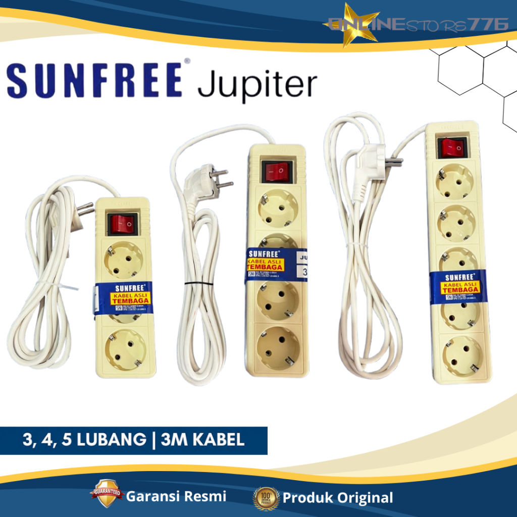 Stop Kontak Arde Sunfree Jupiter 3/4/5 Lubang Panjang Kabel 1,5 Meter / 3 Meter / 5 Meter Terminal Saklar On Off