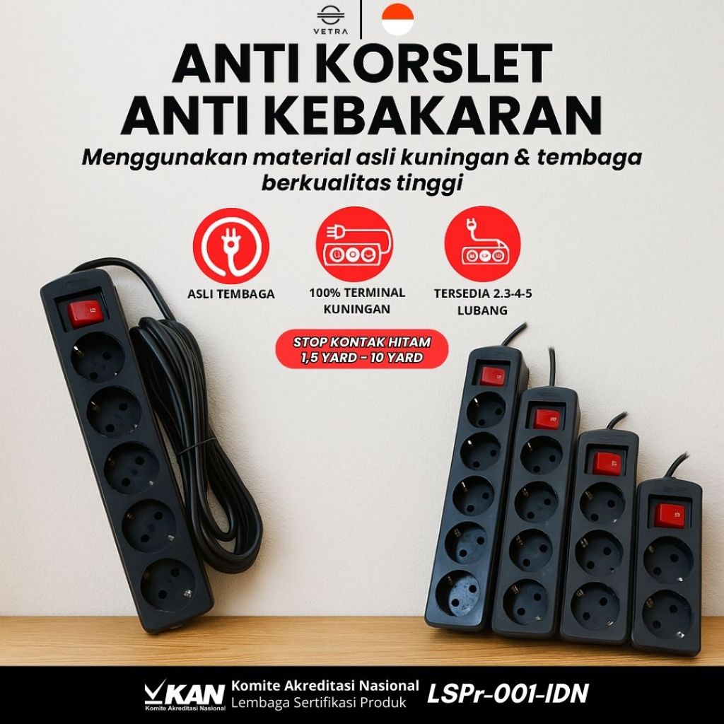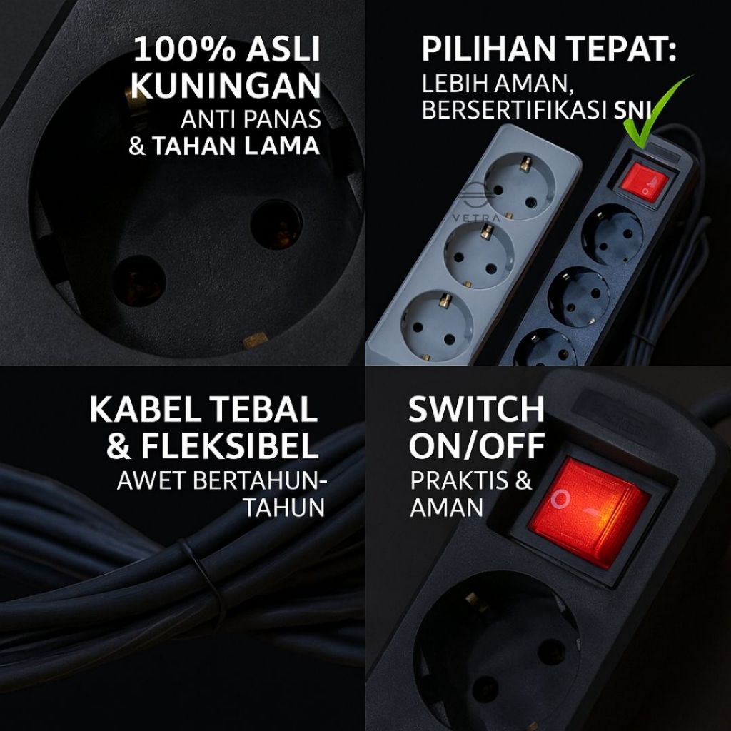 Vetra - Stop Kontak SNI Hitam Lubang + Kabel Panjang 2/3/4/5 1.5/3/5/10 Yard – Anti Korslet & Aman Tahan Lama 16A 250V