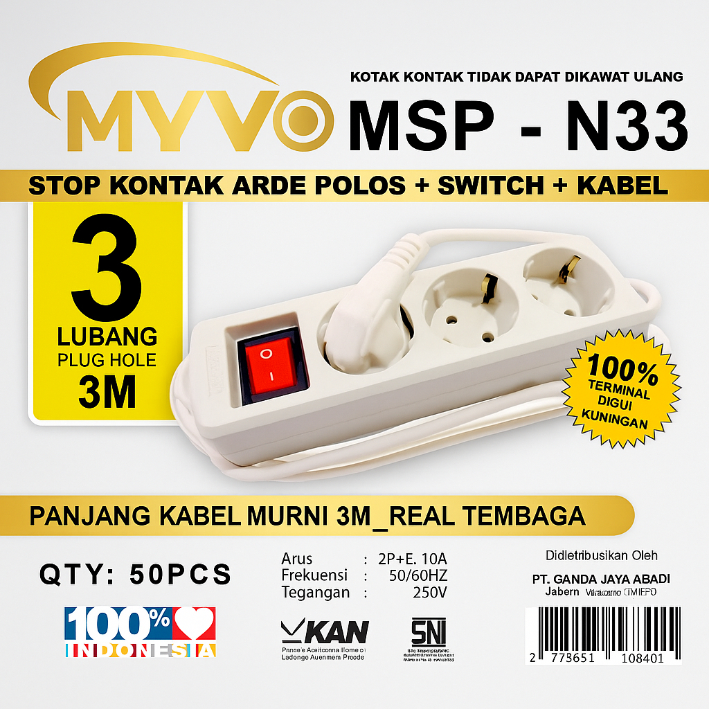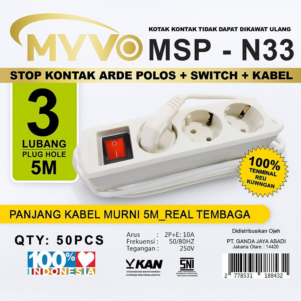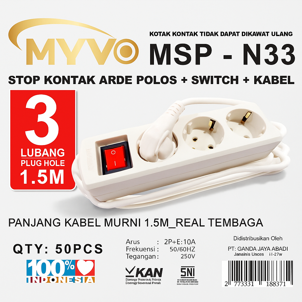 STOP KONTAK KABEL 3 LUBANG 1,5M/3M/5M PUTIH SNI - STOP KONTAK KABEL