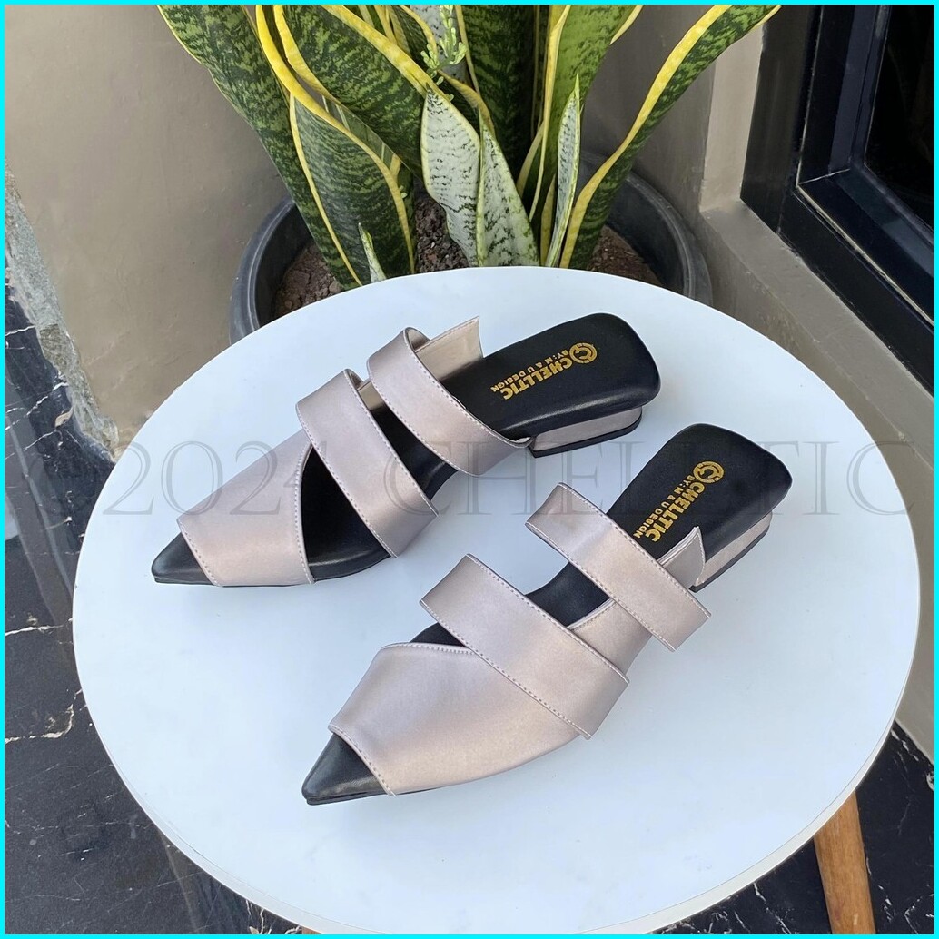 Chelltic - Sandal Wanita Mules Hak Tahu 2cm Terbaru Sepatu Heels Wanita Elegan Party Cewek Korea Sendal Flat Slipon Keki