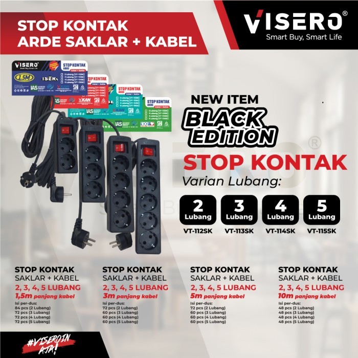 Stop Kontak Arde 5 Lubang 1,5M, 3M, 5M, 10 Meter + Kabel Colokan Visero - HITAM (VT-115SK)
