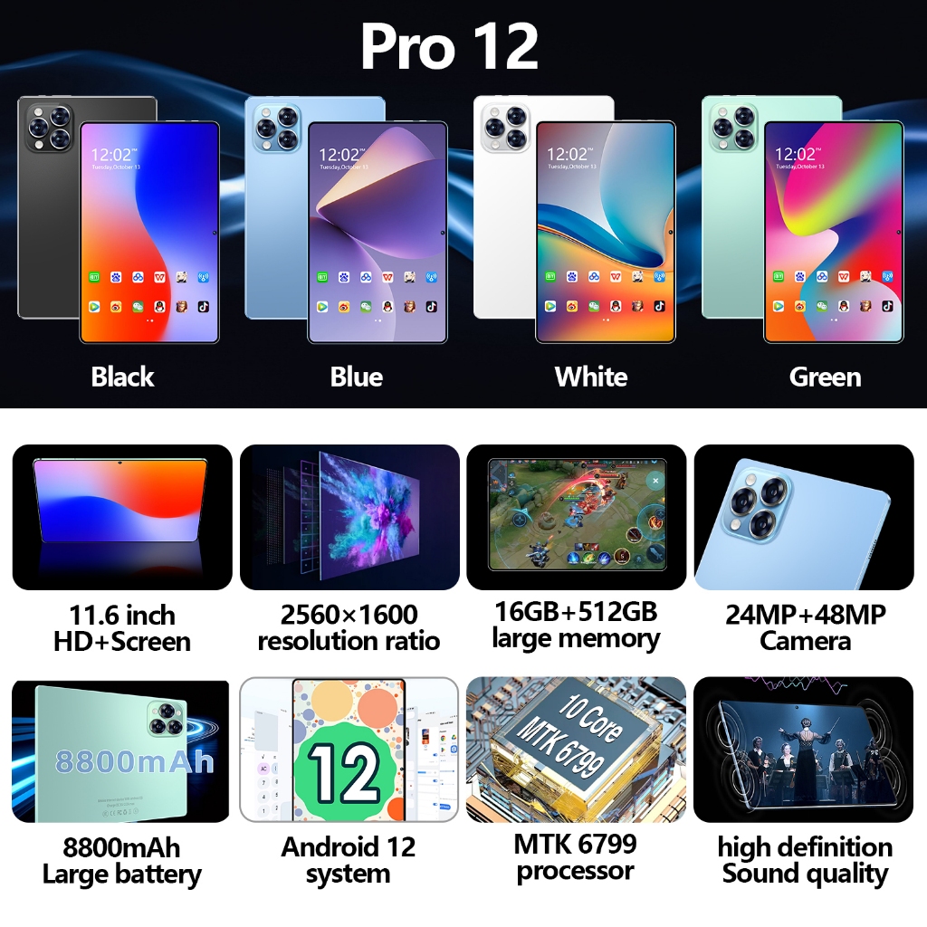 Tablet Pro12 16GB + 1024GB IPS 11.6" Tablet Murah untuk Belajar,Gaming, Kerja & Hiburan 5G Dual SIM, WiFi Tablet Anak Android, Kamera 48MP Kapasitas baterai besar 8800 mAh