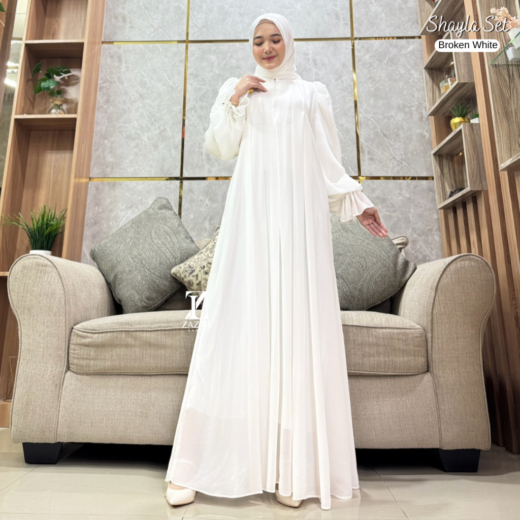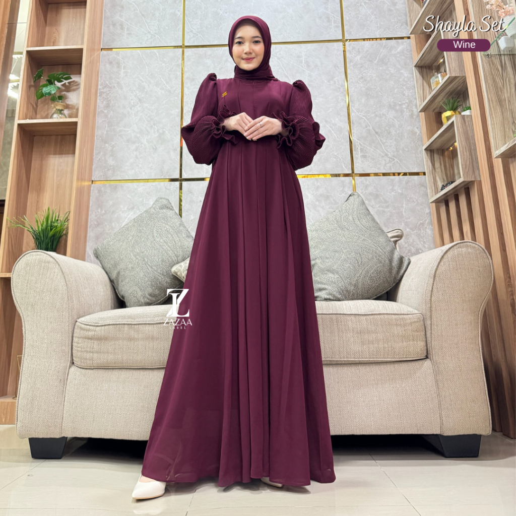 Zazaa Label - Shayla Set Gamis Hijab Ceruty Kombinasi Lengan Plisket Ziper Busui Pesta Mewah