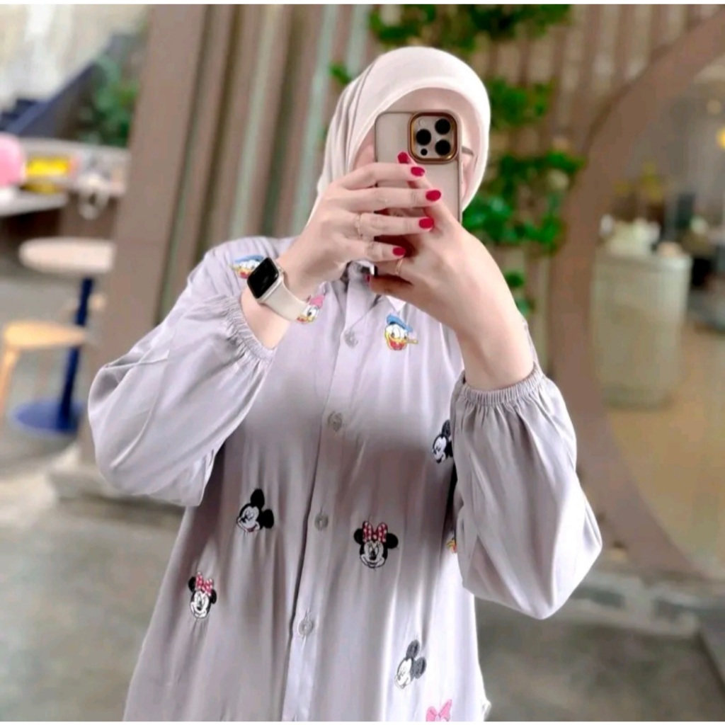 KEMEJA MICKEY ATASAN WANITA BORDIR LUCU RAYON TWILL KEMEJA KEKINIAN BORDIL LUCU