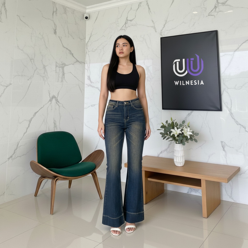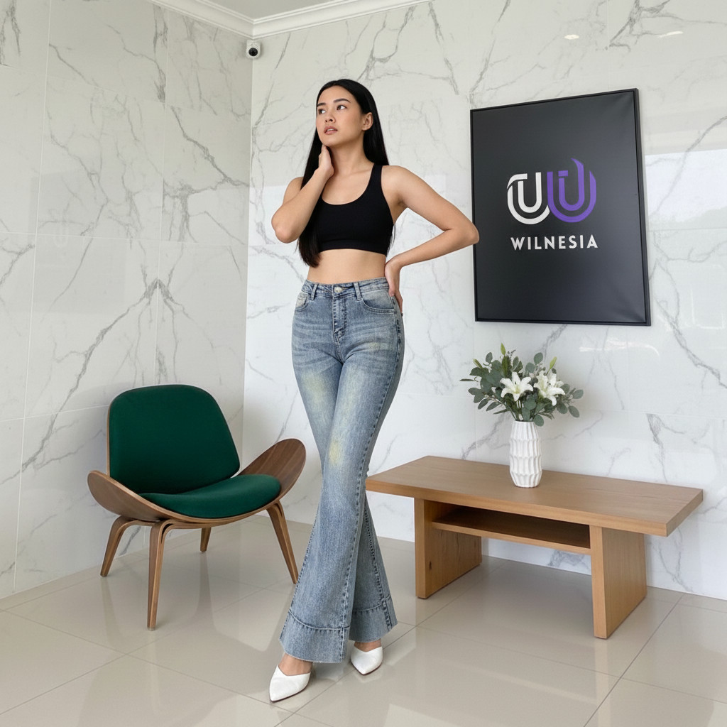 Wilnesia Cutbray Jeans Higwaist Lipat besar Jeans Strech Kekinian Wanita Tinggi Terbaru